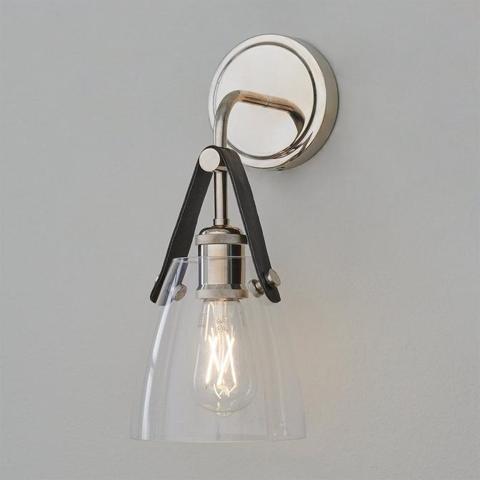 This collection adds a dash of rugged charm with a genuine leather strap accenting the clear glass shades.