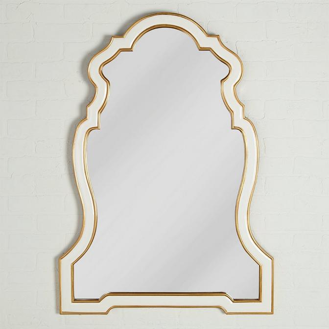 Fashioned with an Art Deco flair, this striking mirror is a perfect focal point for an entryway, bathroom, bedroom or any room in your home. The main frame is intricately arched and finished in a lovely glossy White, then trimmed on the inner and outer borders in Gold leaf or Black with Silver leaf trim. D-rings are attached to the back of the mirror so it is ready to hang right out of the box!