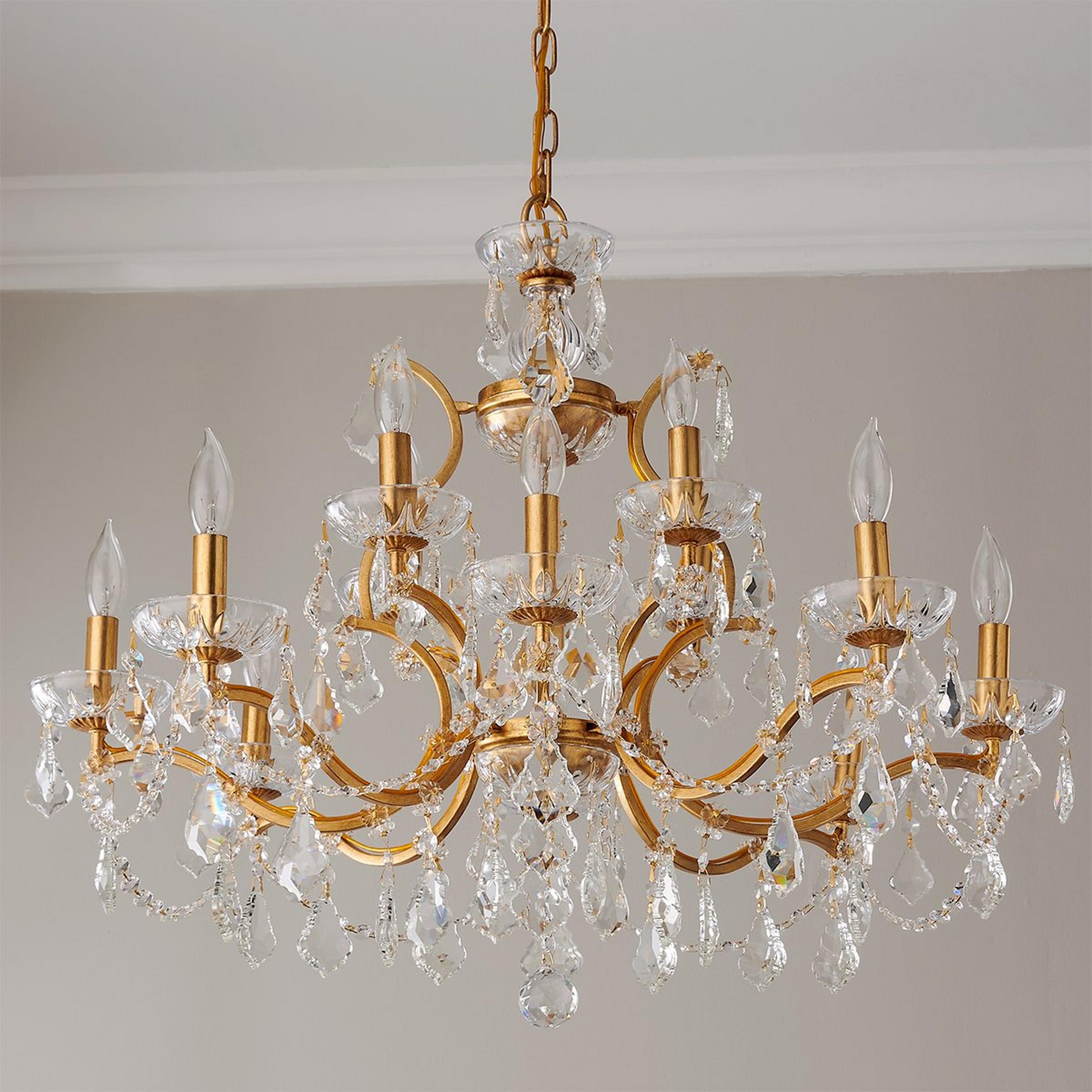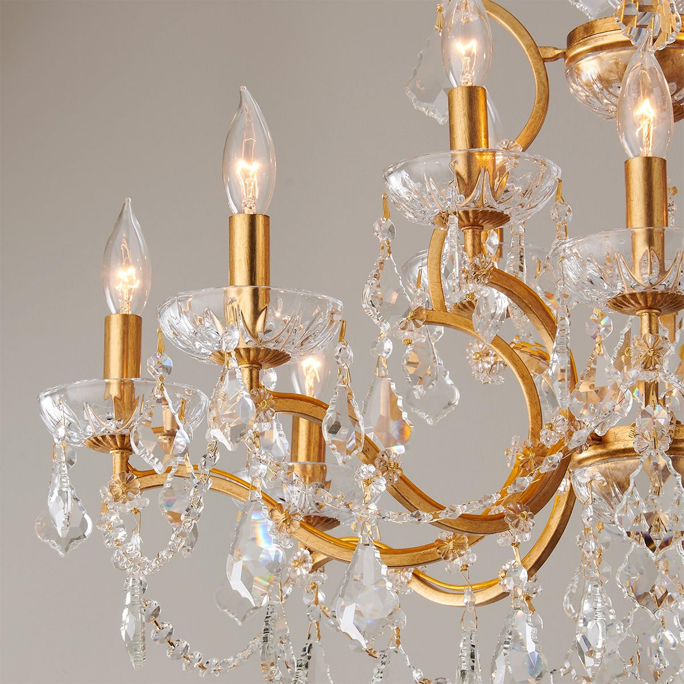 Elevate any room with the glitzy allure of our Gold Leaf and Crystal Chandelier. Whether adorning a lavish bedroom or a sophisticated dining area, this captivating piece leaves a lasting impression. Complemented by an embossed canopy, it is sure to add a touch of grandeur to any space.