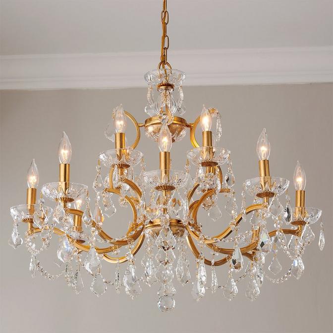 Elevate any room with the glitzy allure of our Gold Leaf and Crystal Chandelier. Whether adorning a lavish bedroom or a sophisticated dining area, this captivating piece leaves a lasting impression. Complemented by an embossed canopy, it is sure to add a touch of grandeur to any space.