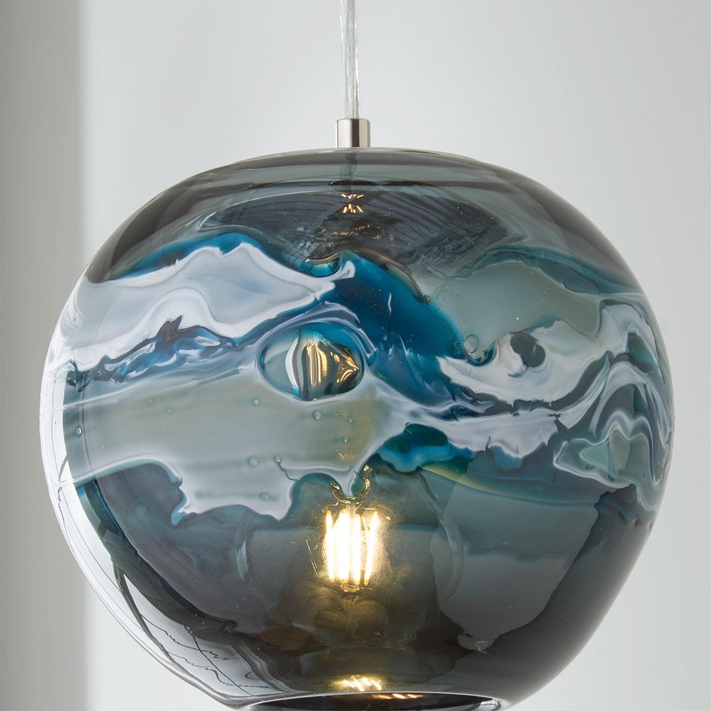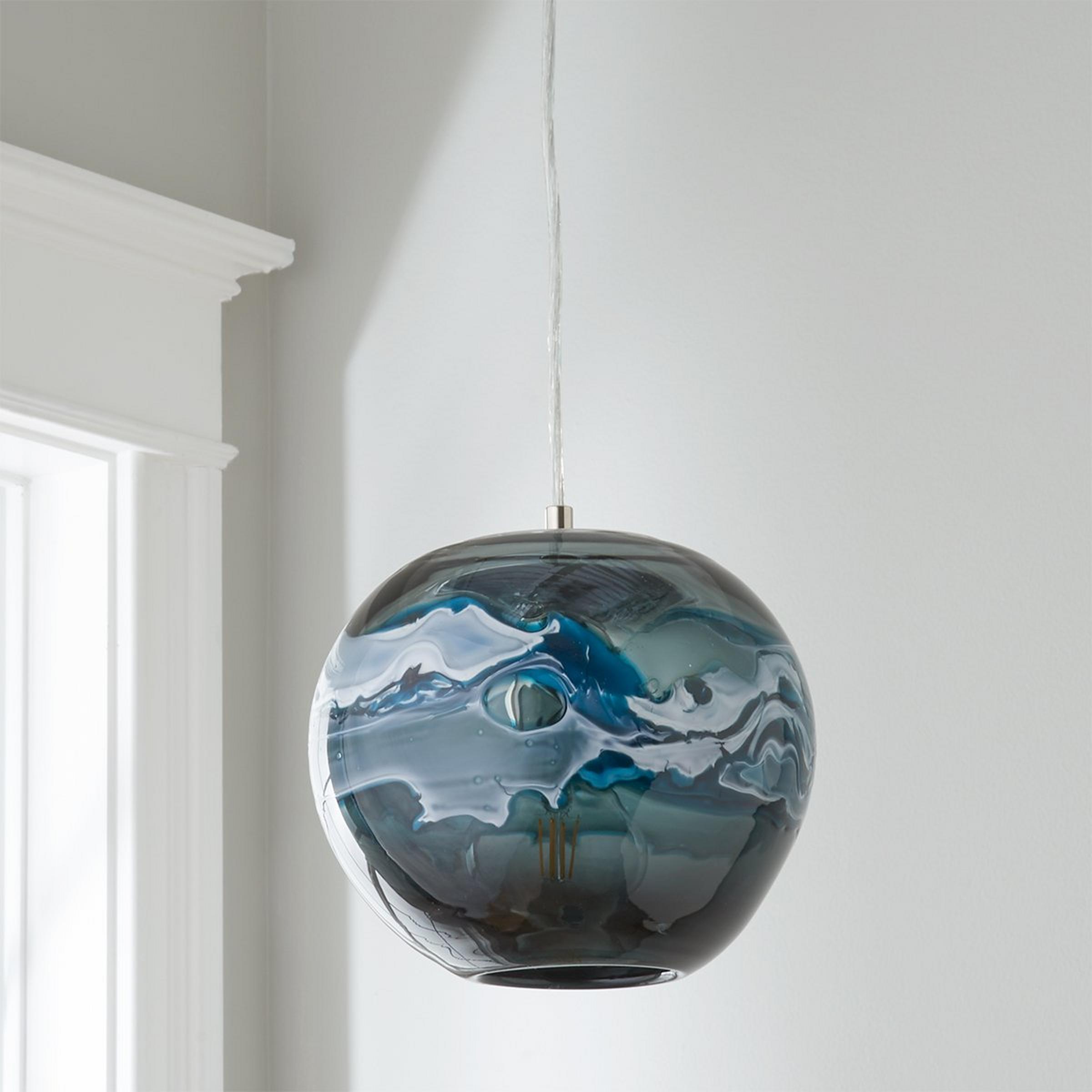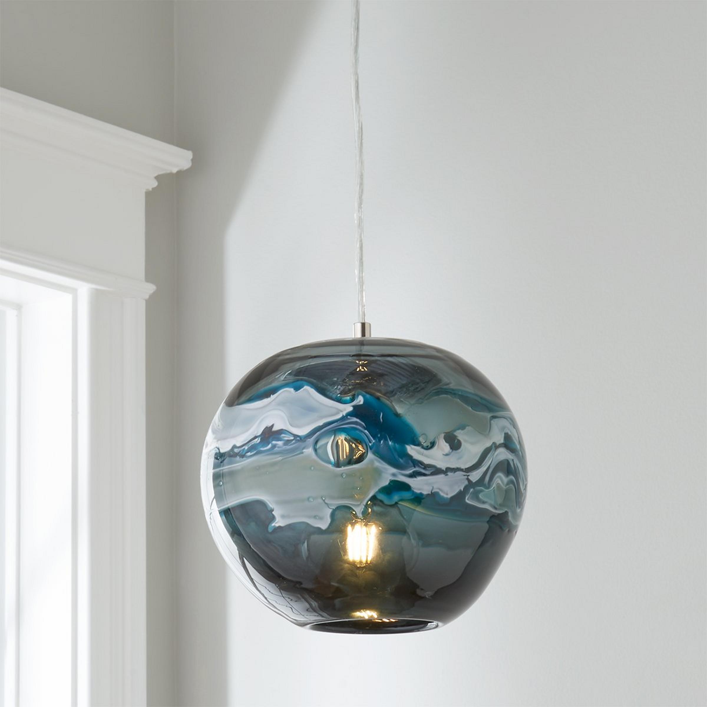 Blue and white art glass swirl tempestuously through the middle of this round pendant, creating a pendant light that has the look of the ocean raging during a storm. This light is perfectly at home in a coastal New England kitchen, or in a modern dining room. Due to the nature of art glass no two will be exactly alike in color, pattern, or shape.