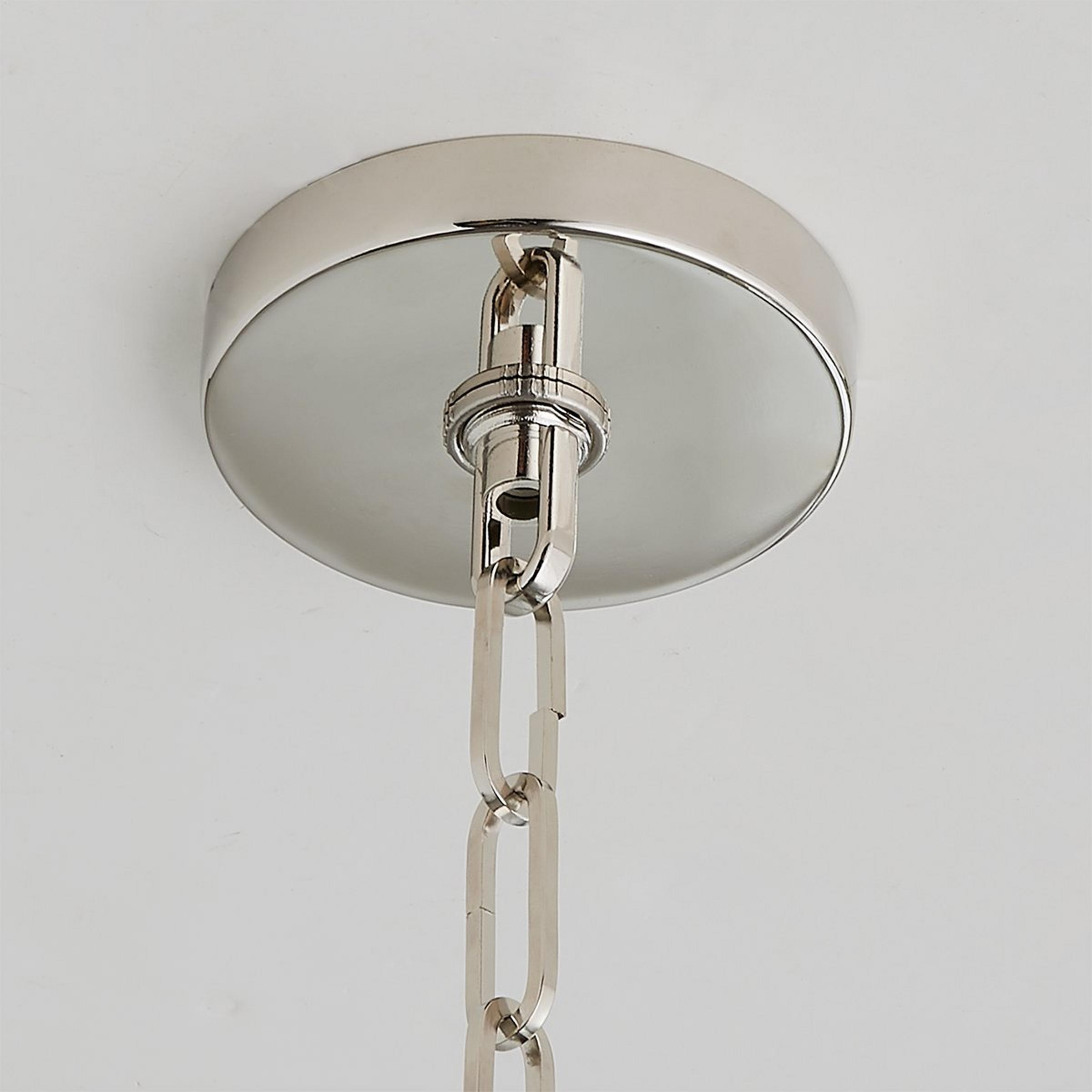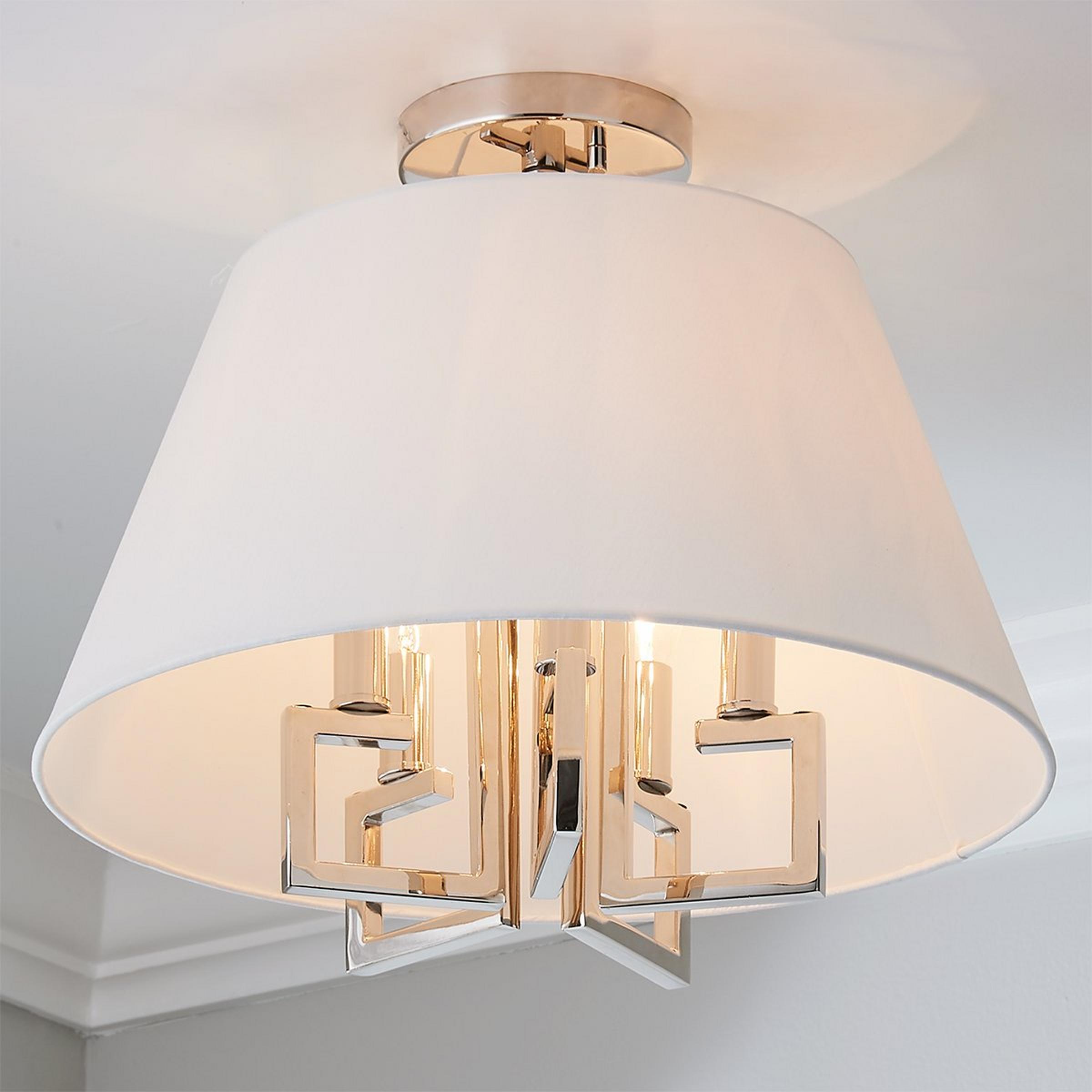 Lovely yet simple, this mini chandelier converts to a ceiling light. The Greek Key Polished Nickel details and crisp fabric shade will provide contemporary style and soft diffused lighting in a small foyer, hallway, bedroom or closet. (40W bulbs recommended)