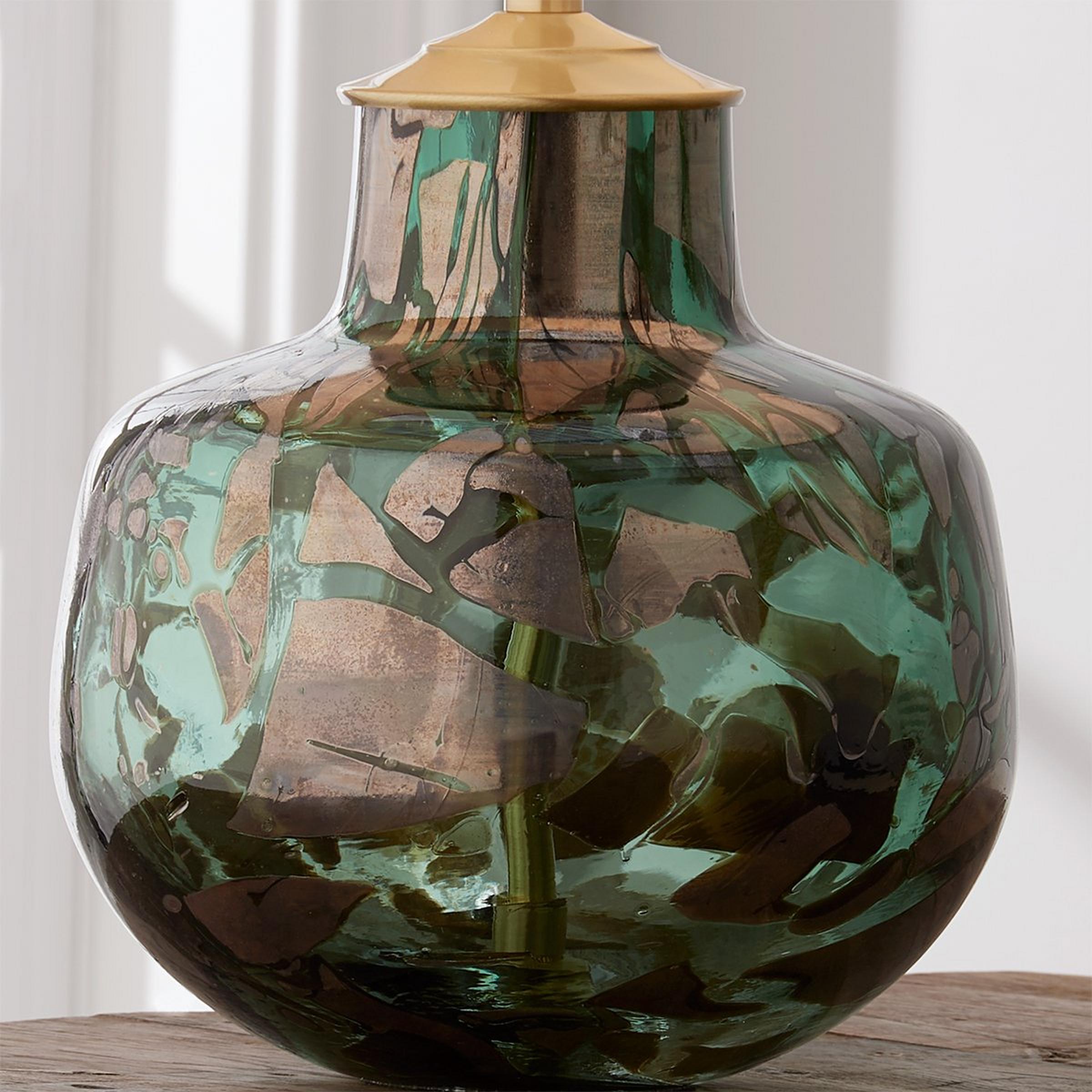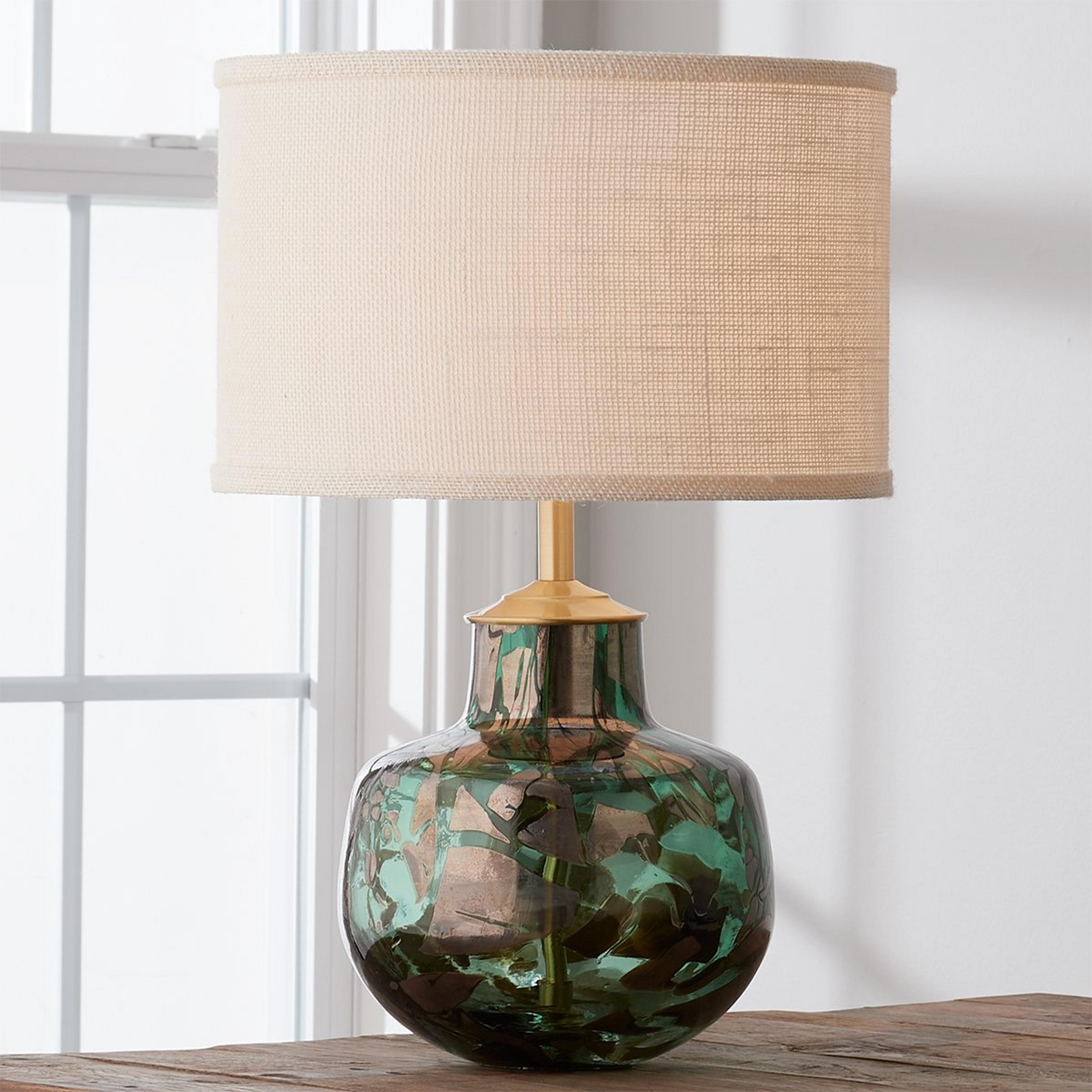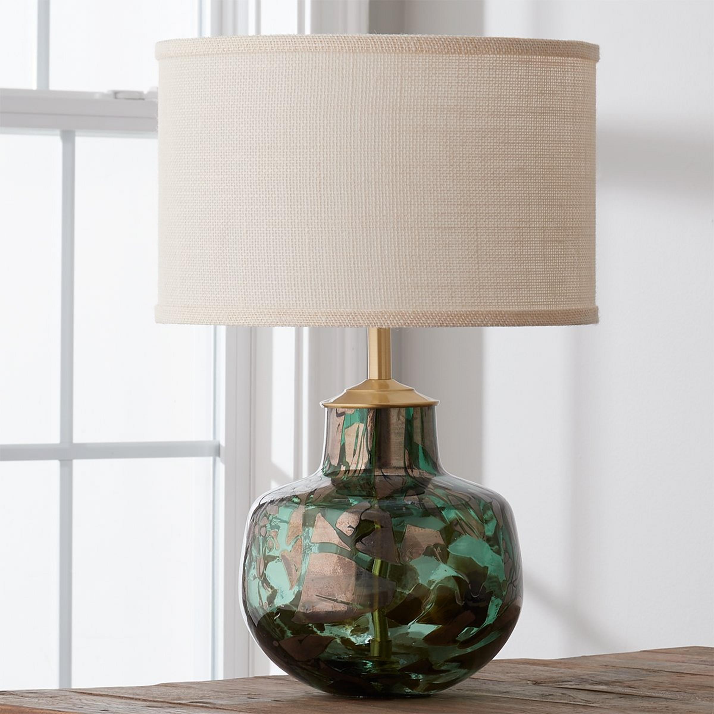 Deep emerald art glass with shimmering bronze chunks in this simple shape is a perfect, colorful accent for any space. This table lamp is is assembled by hand in our Richmond, Virginia production facility.