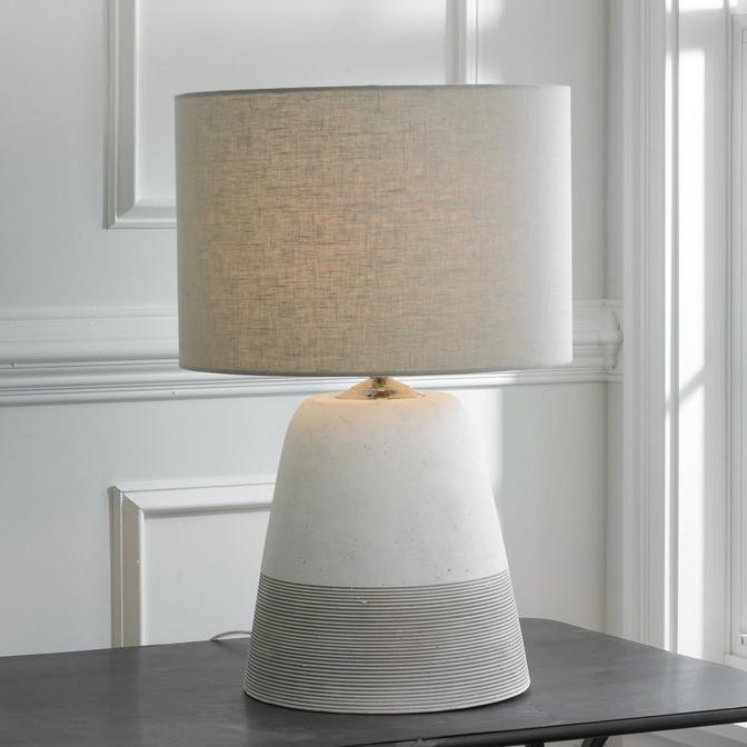 This stunning modern grooved concrete table lamp comes in a neutral Light Gray finish highlighted by concentric ringed grooves emanating from the base upwards for a modern accent to this table lamp. Outfitted with a crisp gray linen drum shade, this table lamp will make the perfect addition to any modern or transitional decor. This table lamp is assembled by hand in our Richmond, Virginia production facility.