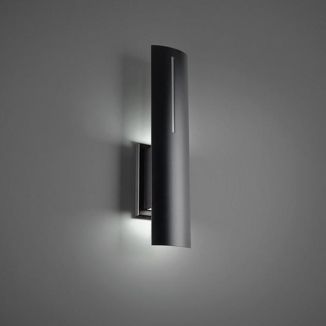 This functional sconce shines ambient lighting directed at the wall, emphasizing texture. It punctuates a walkway or front entry with a luxurious look. The shield-shaped shade has a vertical slit to let a thin beam of light through the front, integrating the glow into the design itself. Color temperature changes can be made at time of installation by selecting from 3000k, 3500k, or 4000k.