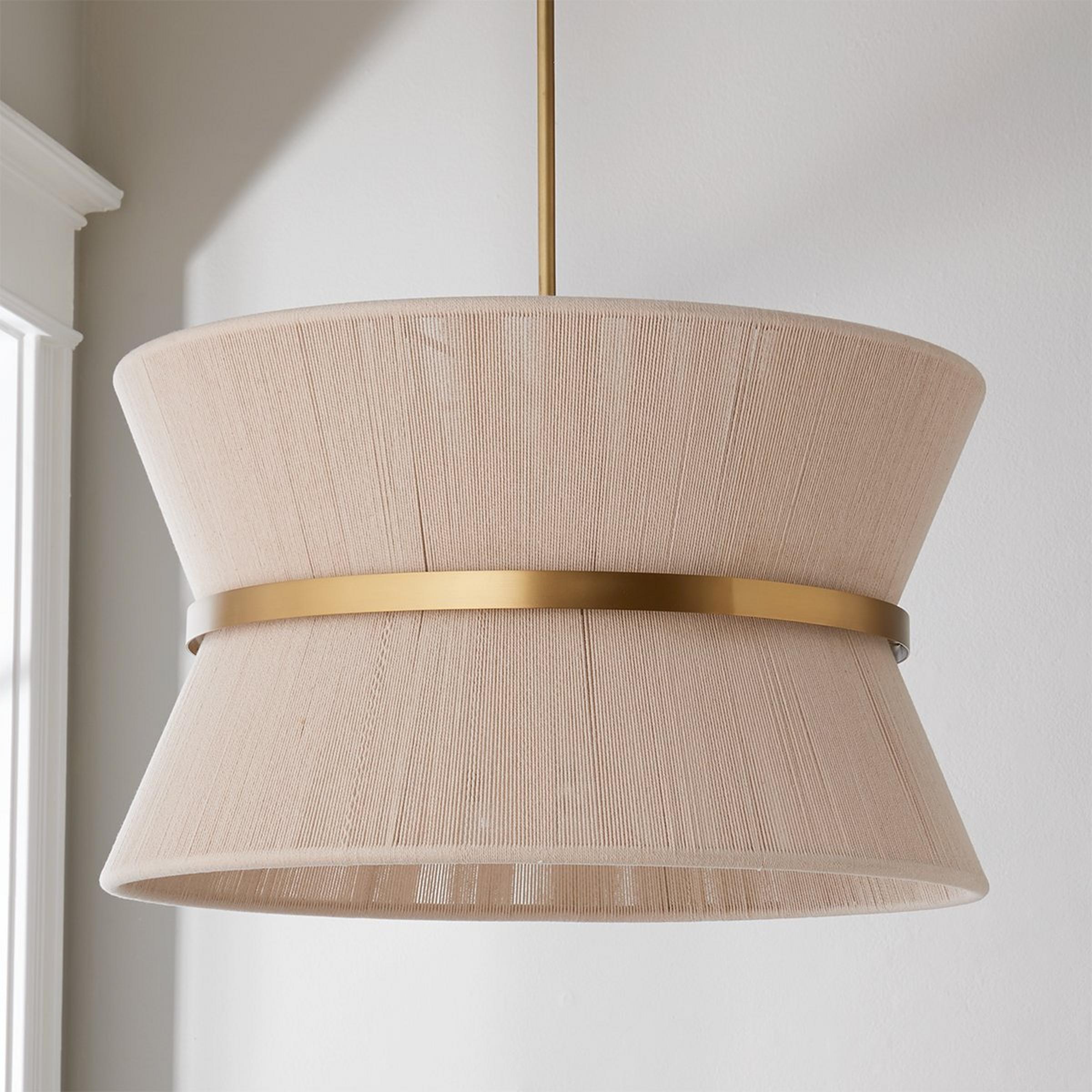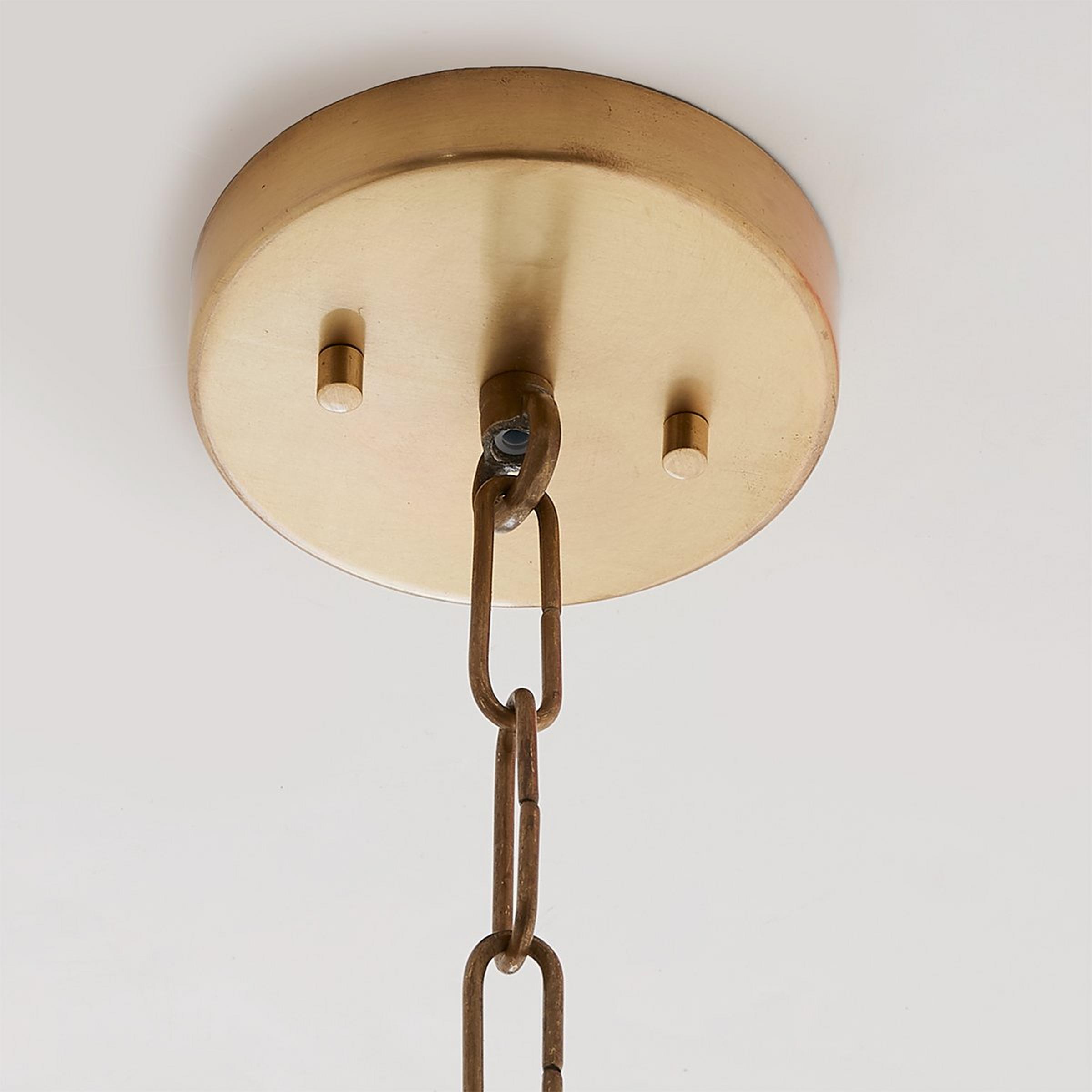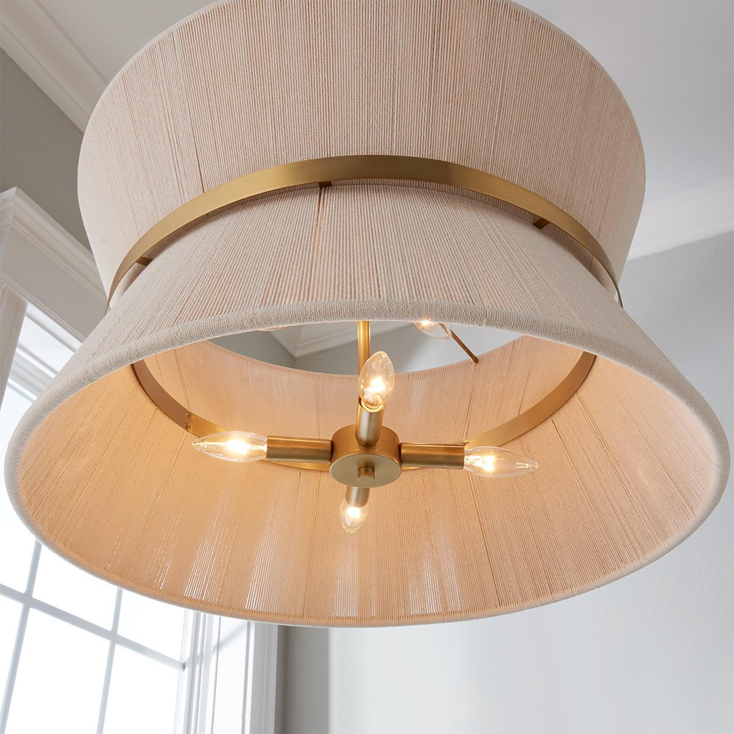 Our Halia Chandelier Collection has eye-catching elegance, drawing inspiration from classic, Hollywood style. This collection has a perfect pendant and foyer chandelier. An artisan's touch is incorporated into each fixture's loomed hourglass silhouette for a unique yet trendy design. An arrangement of sizes is available to complete your space's needs. This fixture has handcrafted details, meaning subtle variation from piece to piece makes each light unique. The natural ivory rope is hand-bleached, the rope is hand-wrapped, and the brass patina is hand-applied.