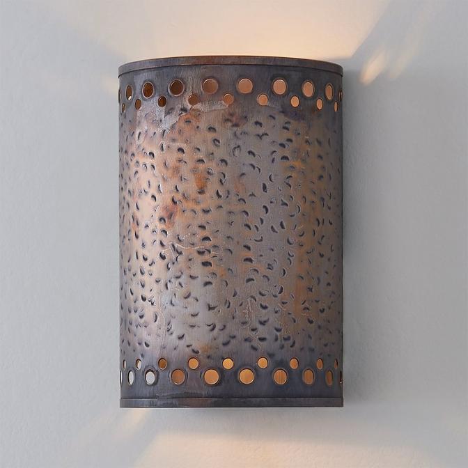 Designed by our founder for a friend, this light was immediately in demand. Handcrafted in Richmond, Virginia with a hand applied distressed and aged copper finish features a border of punched holes in 2 sizes that let light peek out. The up and down light effects combine to create patterns while reducing glare. <!--exclusive-->