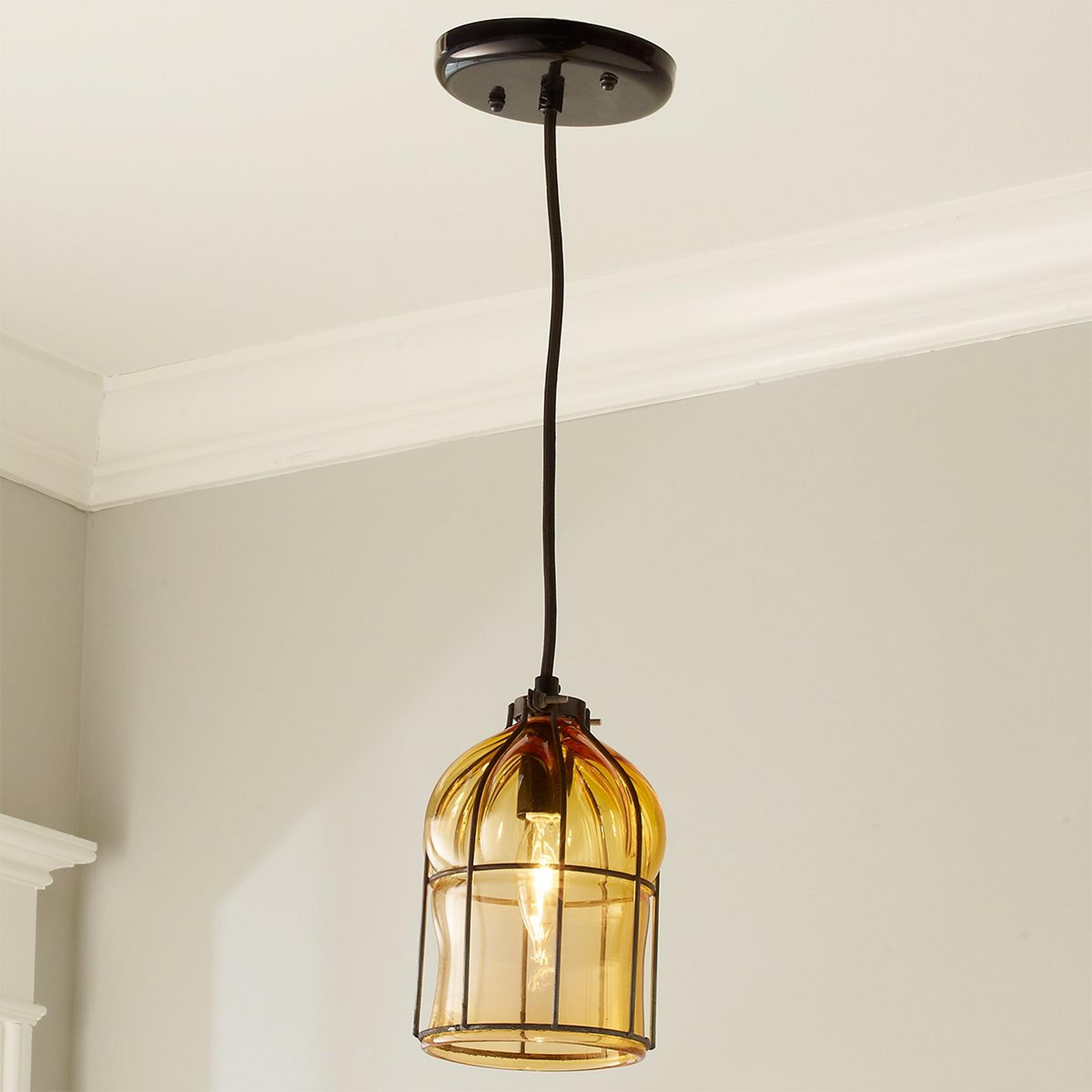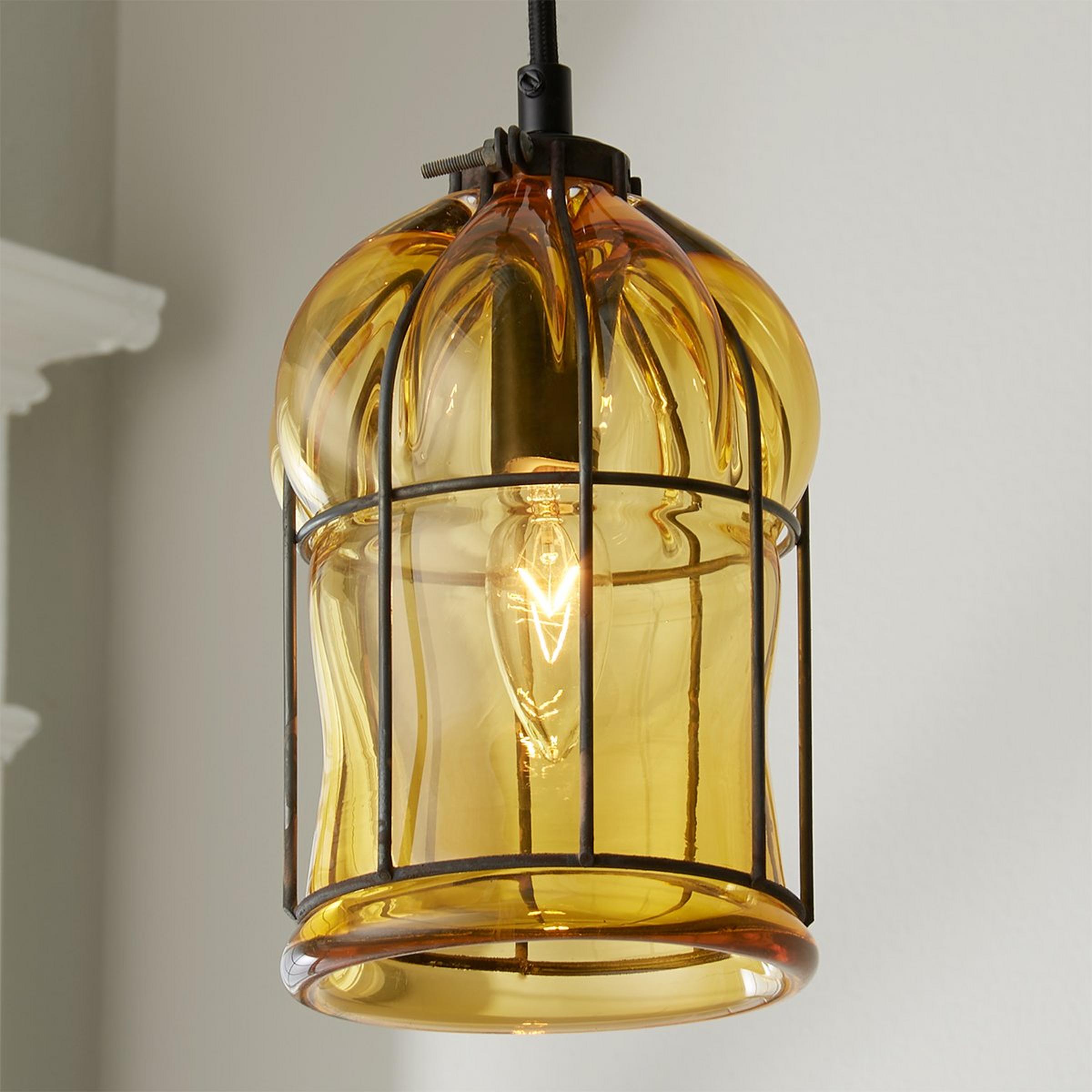 Hand blown glass by a local Virginia artisan shines in this industrial, yet colorful pendant brought to us as part of the Wendy Umanoff collection exclusive to Shades of Light. Perfectly imperfect, these pendants fit into any eclectic kitchen, or modern bar. Due to the nature of this hand blowing process no two will be exactly alike in color, pattern, or shape.