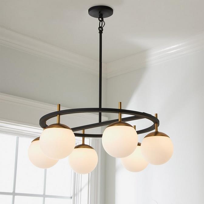 Materials, shapes and finishes combine harmoniously in these clean minimalist-style light fixtures. Contrasting Black and Satin Gold metals merge nicely with the Opal glass globes for a truly spectacular mid-century design.