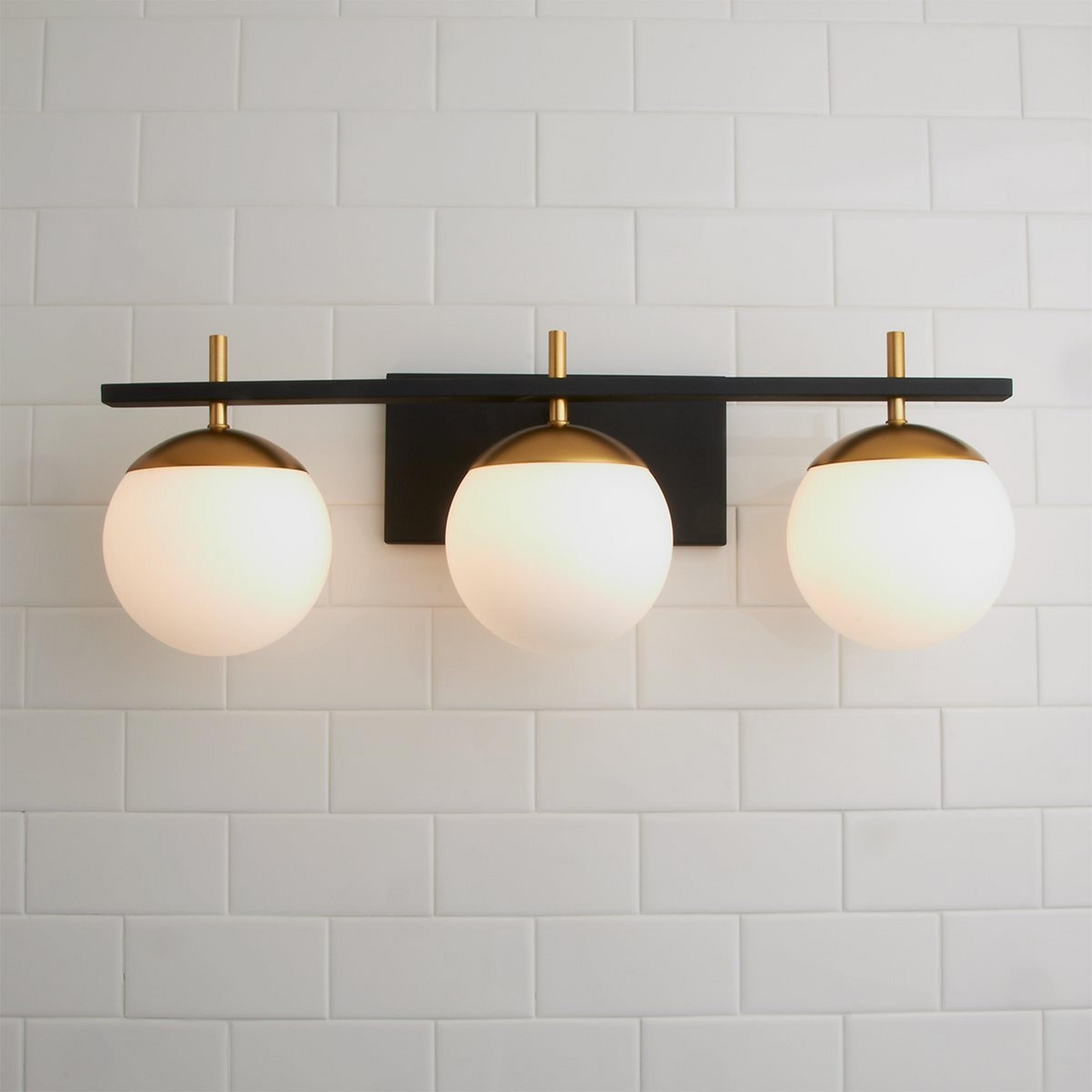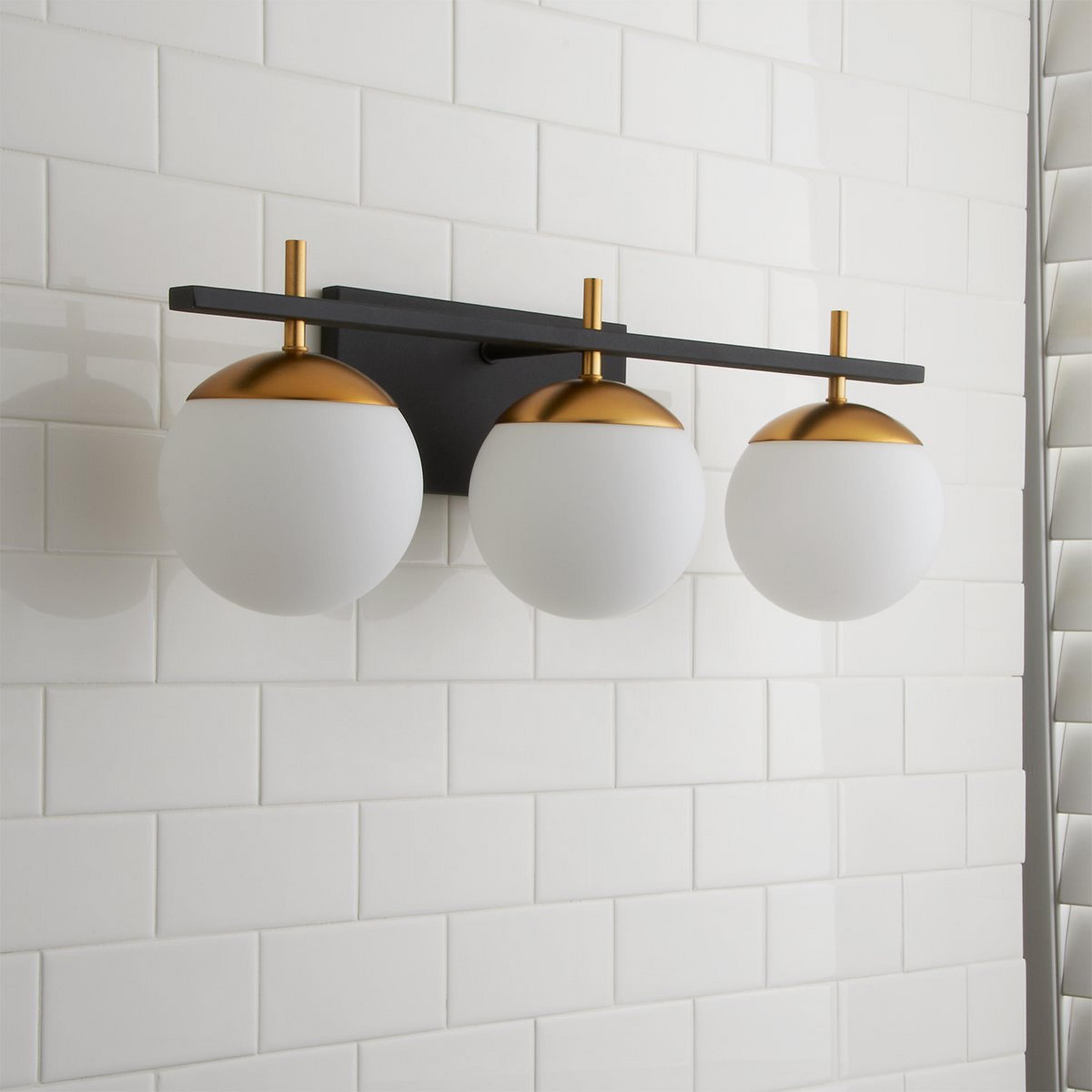 Materials, shapes and finishes combine harmoniously in these clean minimalist-style vanity lights. Contrasting black and satin gold metals merge nicely with the opal glass globes for a truly spectacular design.