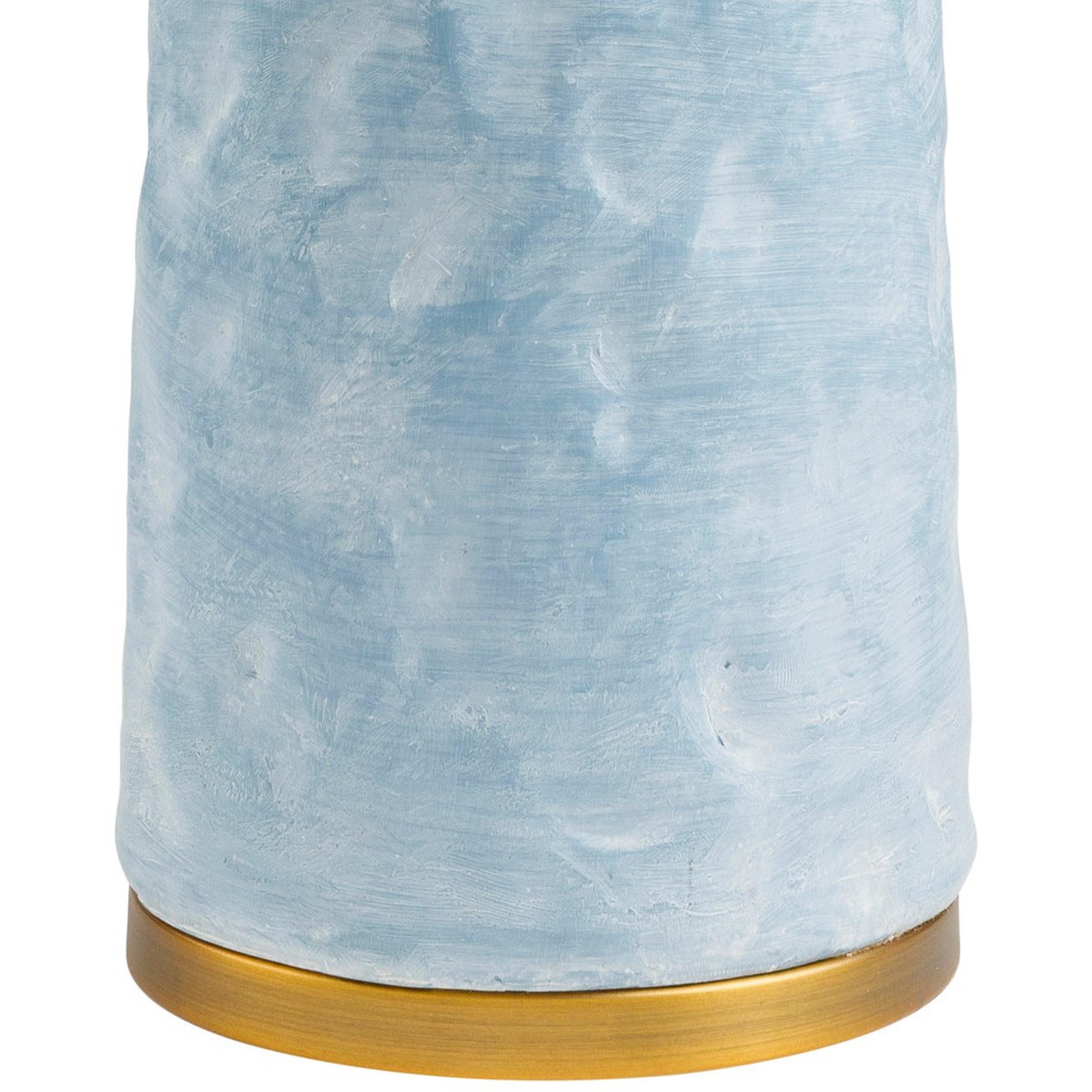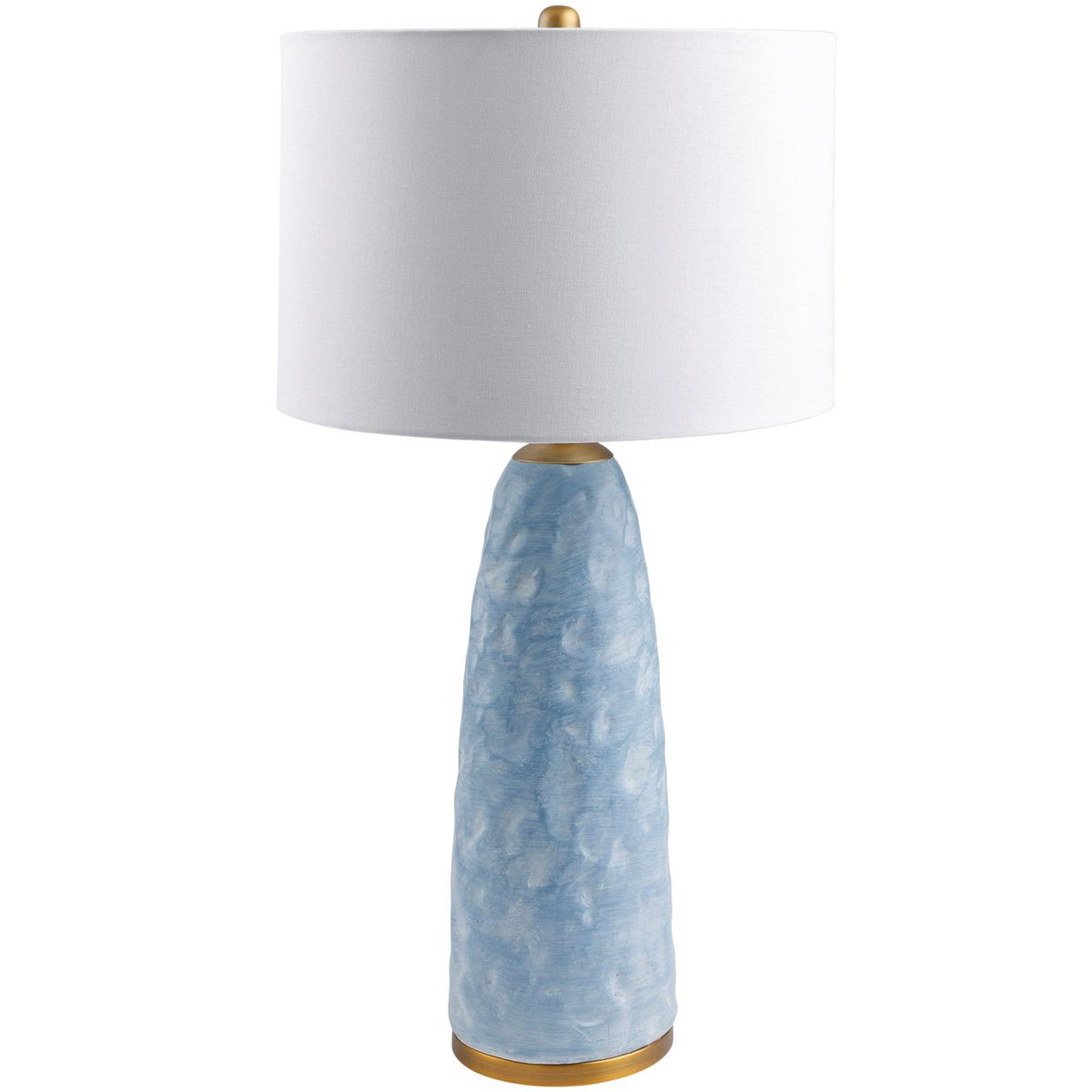 The resin body of this tall, skinny table lamp features a distressed finish resembling carved wood or chiseled stone. Capped on both ends with metal details, this light is balanced, thoughtful, and forthright.