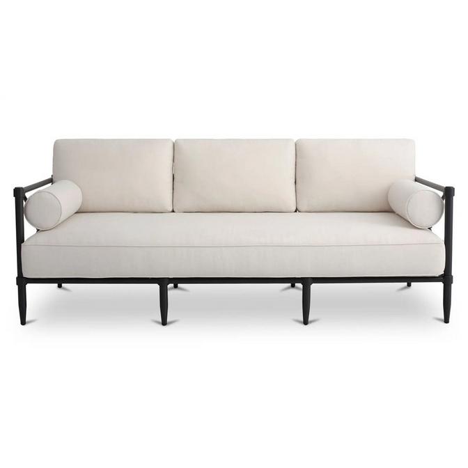 Classic lines are reimagined for contemporary outdoor spaces in our Hyperion Outdoor Sofa. This charming sofa upgrades a simple boxy frame with tapered legs, cylindrical joinery, and attention-grabbing crisscross decorative accents. Built to last, Hyperion features two versatile bolster pillows, fade-resistant recycled performance upholstery, fiber fill, quick-dry foam cushions, and PVC webbing suspension for a supportive seat that brings indoor comfort to your patio or poolside. Cover or store indoors during winter or inclement weather; ensure fabric is fully dry before storage.