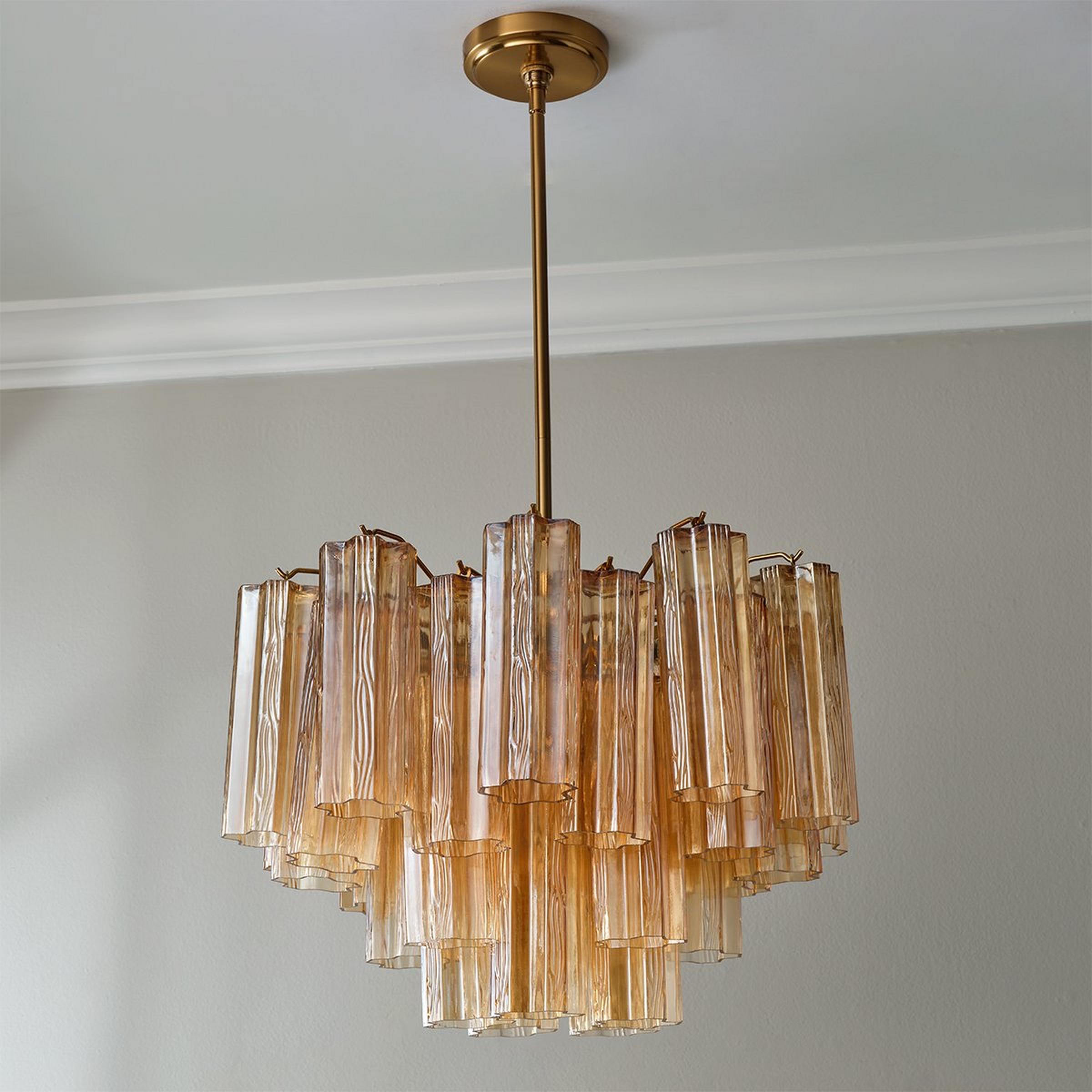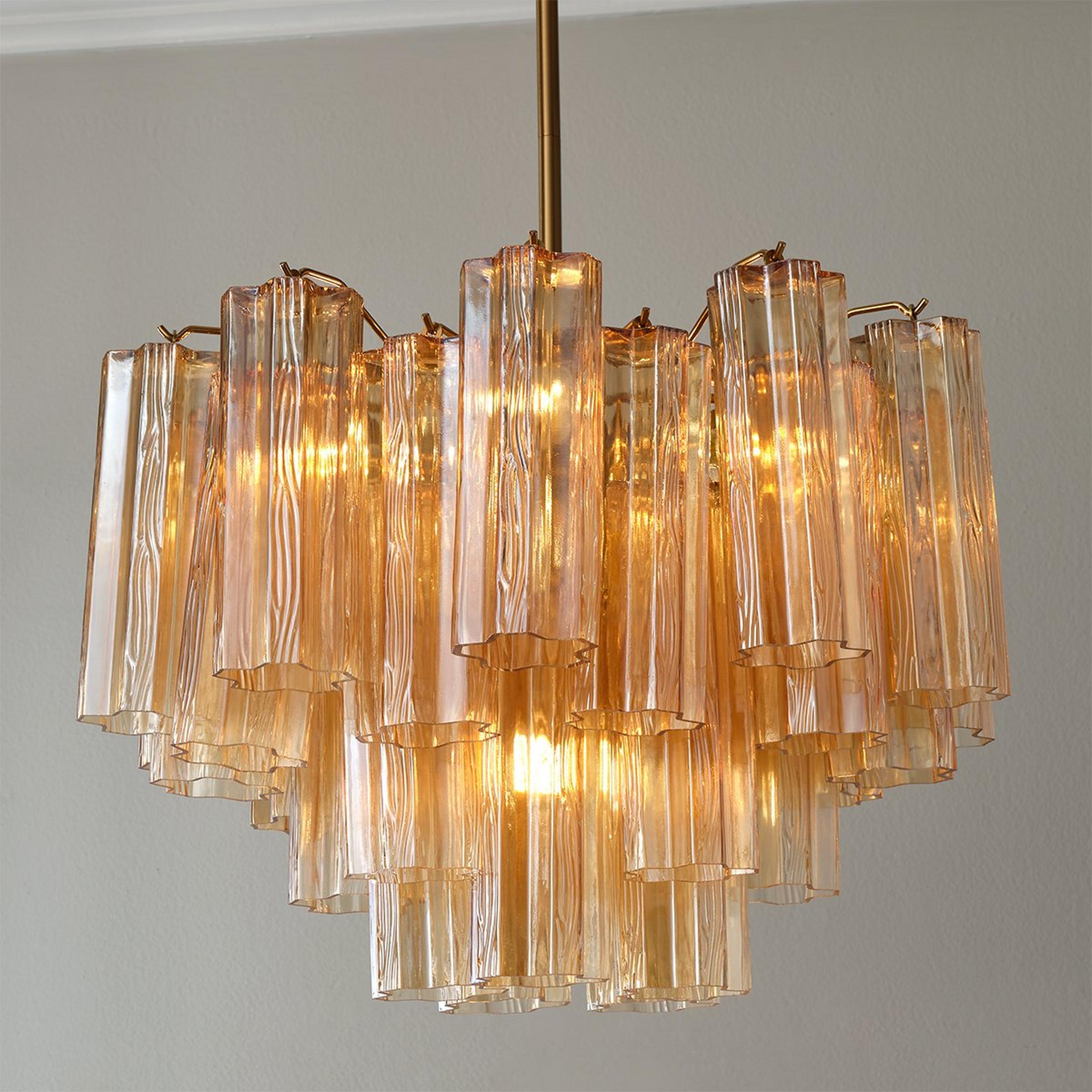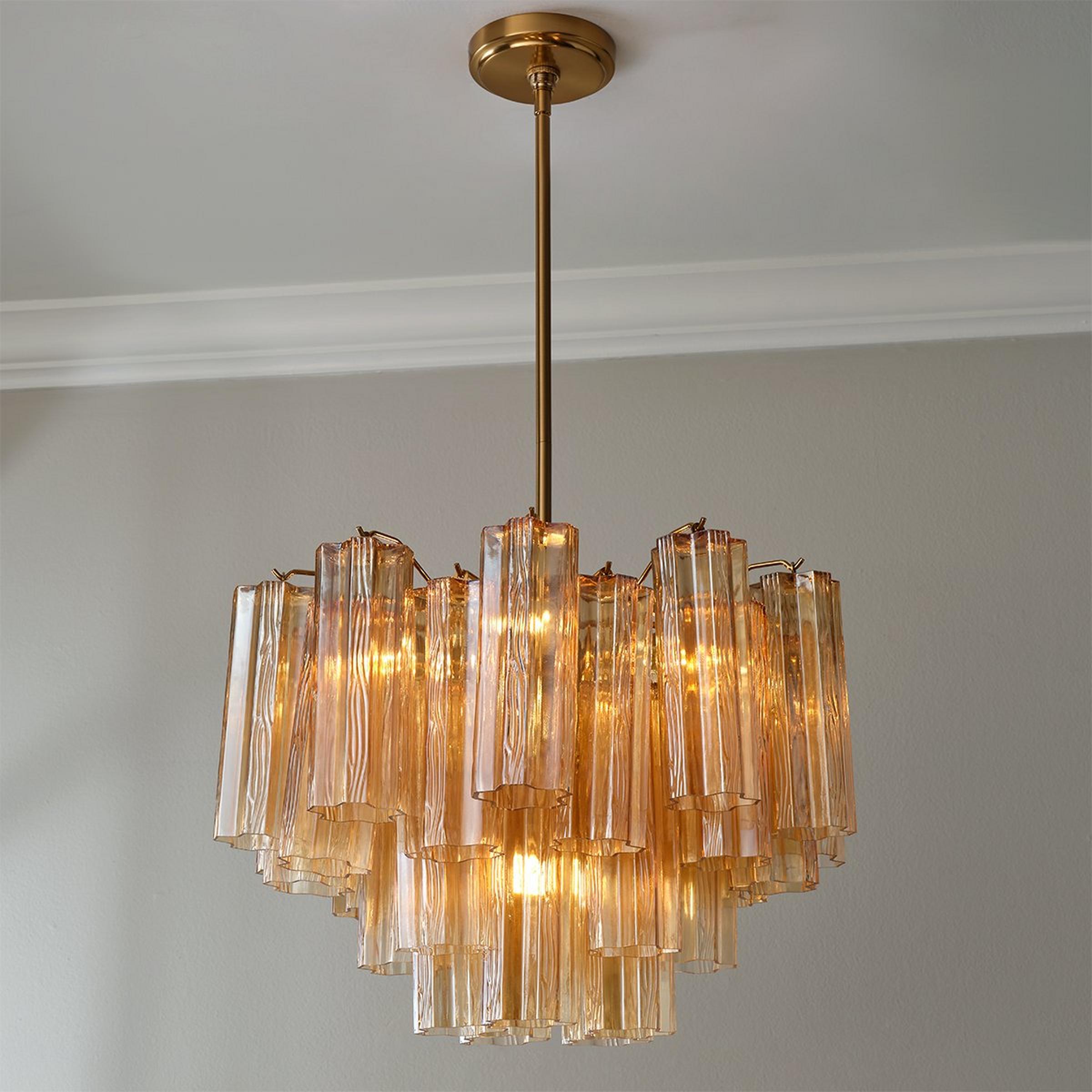 Our Imondo Chandelier offers a spectacular example of just how elegant lights and glass can become when they interact. Each dazzling shade, available in a variety of tints and colors, is textured with a five-pointed ridged profile. Its geometric design and tiered format are quintessentially modern and demonstrate a resurgence of the classic Italian Tronchi chandelier.