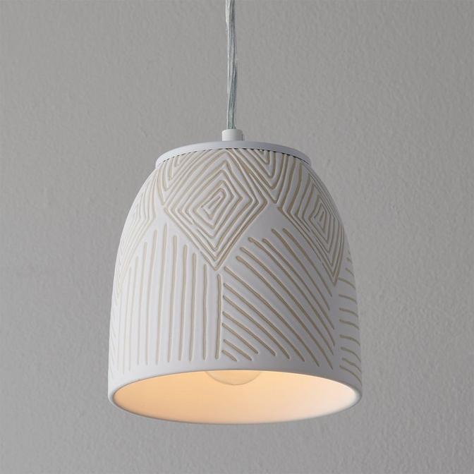 The Impress Pendant captures the soul of artisan craftsmanship with its bowl-shaped pottery form and distressed white finish. Intricate designs are etched around the exterior, adding texture and charm. Each detail evokes a sense of artistry, grounding your space with a piece that feels both storied and sophisticated. No two fixtures will be exactly alike in pattern. This fixture is assembled by hand in our Richmond, Virginia production facility.