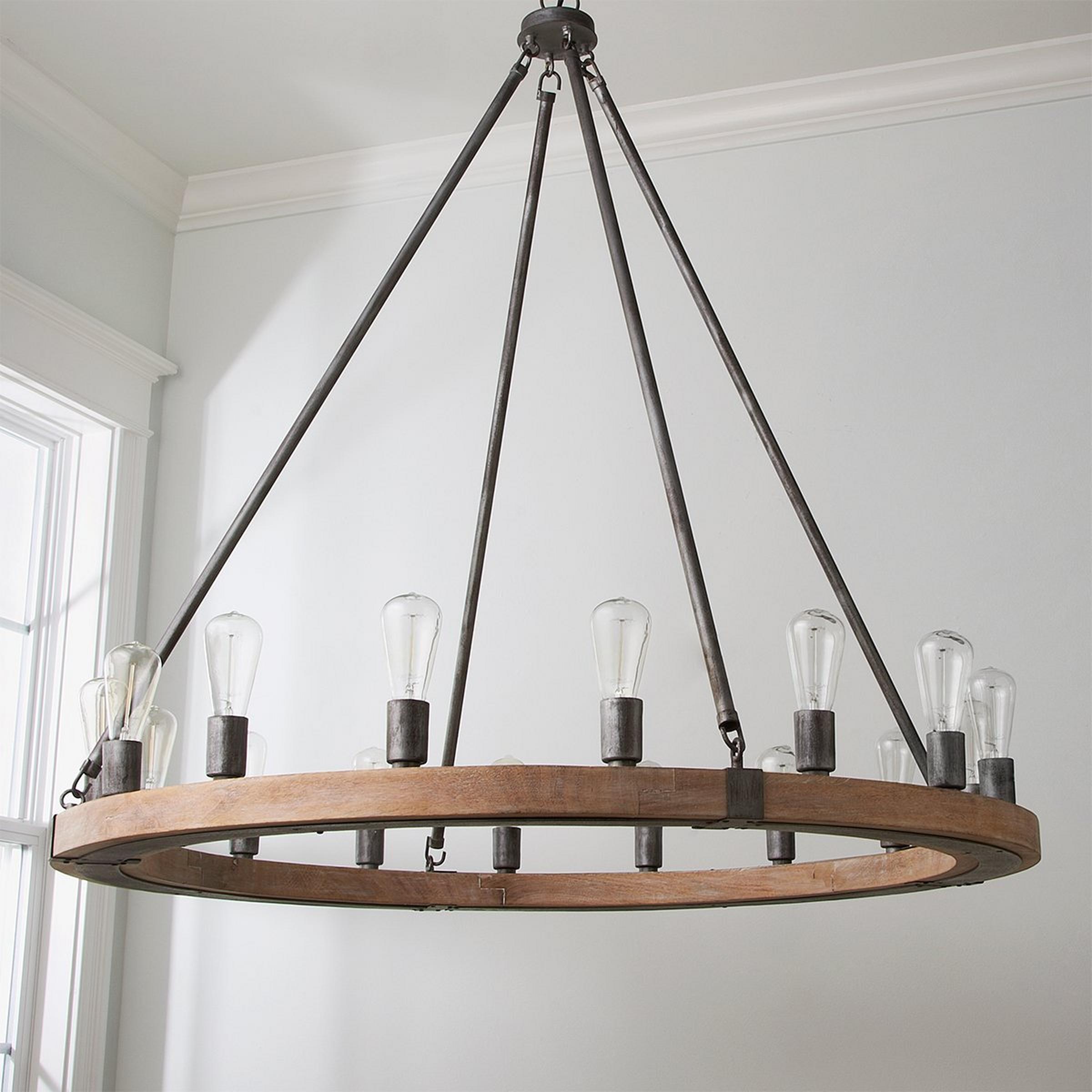 The Industrial Farmhouse Ring Chandelier anchors the room with its bold circular silhouette and artisanal blend of wood and metal. A halo of exposed filament bulbs casts a golden glow, evoking poetic illumination and vintage charm. Suspended by angled rods for sculptural balance, this fixture transforms any room into an atmospheric sanctuary of light and texture. Drawing inspiration from rustic refinement, this chandelier offers a dramatic focal point for vaulted ceilings, refined living spaces or grand foyers