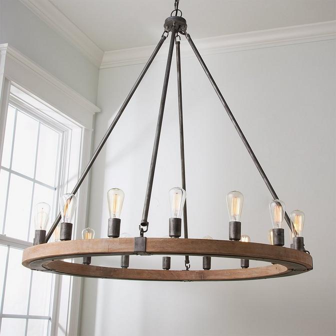 The Industrial Farmhouse Ring Chandelier anchors the room with its bold circular silhouette and artisanal blend of wood and metal. A halo of exposed filament bulbs casts a golden glow, evoking poetic illumination and vintage charm. Suspended by angled rods for sculptural balance, this fixture transforms any room into an atmospheric sanctuary of light and texture. Drawing inspiration from rustic refinement, this chandelier offers a dramatic focal point for vaulted ceilings, refined living spaces or grand foyers