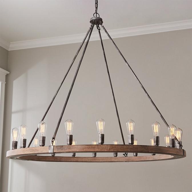 The Industrial Farmhouse Ring Chandelier anchors the room with its bold circular silhouette and artisanal blend of wood and metal. A halo of exposed filament bulbs casts a golden glow, evoking poetic illumination and vintage charm. Suspended by angled rods for sculptural balance, this fixture transforms any room into an atmospheric sanctuary of light and texture. Drawing inspiration from rustic refinement, this chandelier offers a dramatic focal point for vaulted ceilings, refined living spaces or grand foyers