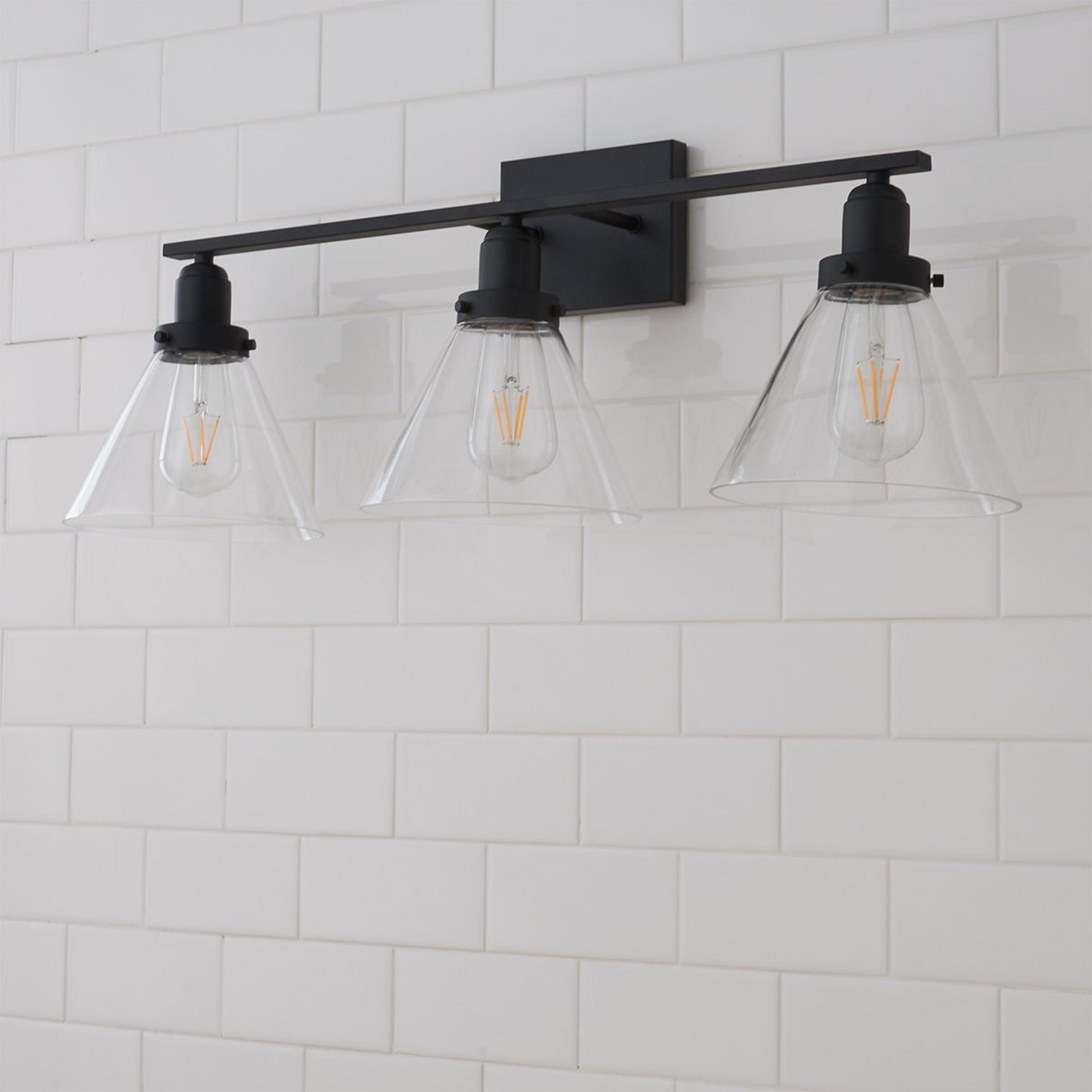 Industrial minimalism defines this stylish bath light, which pairs a simple body with classic triangular shades. For a statement fixture in your vanity area, this wall light will keep your bathroom bursting with light and style.