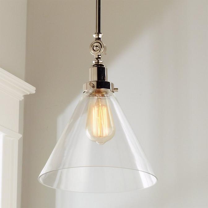 Industrial minimalism defines this simple and stylish pendant, which pairs a simple adjustable body with a classic triangular clear glass shade.
