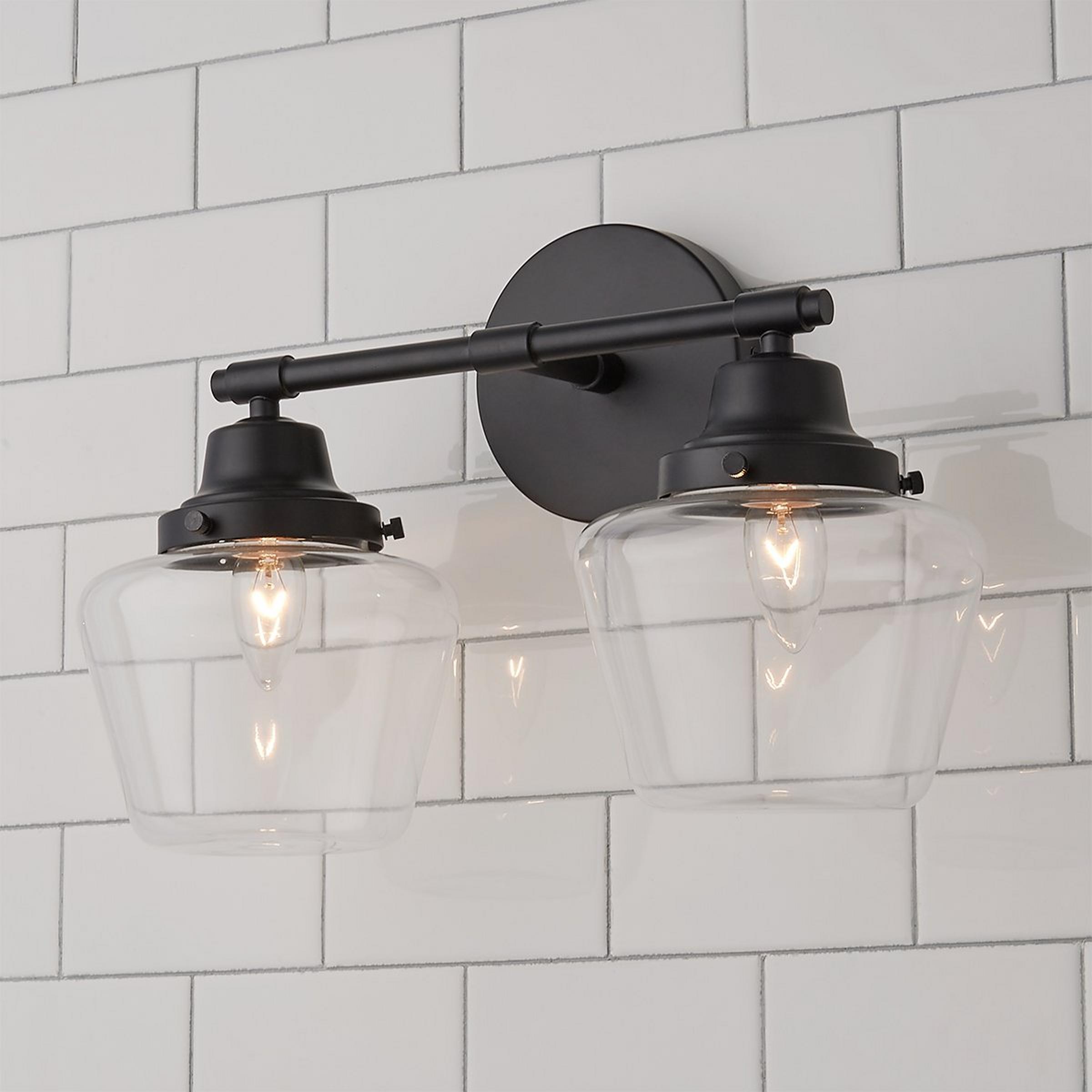 The Jacobson Collection features a unique soft industrial persona with bolted hardware and a clear cut shade. The reversed tapered shade shape offers a fun detail that will be a welcomed accessory in your transitional bathroom or vanity area.