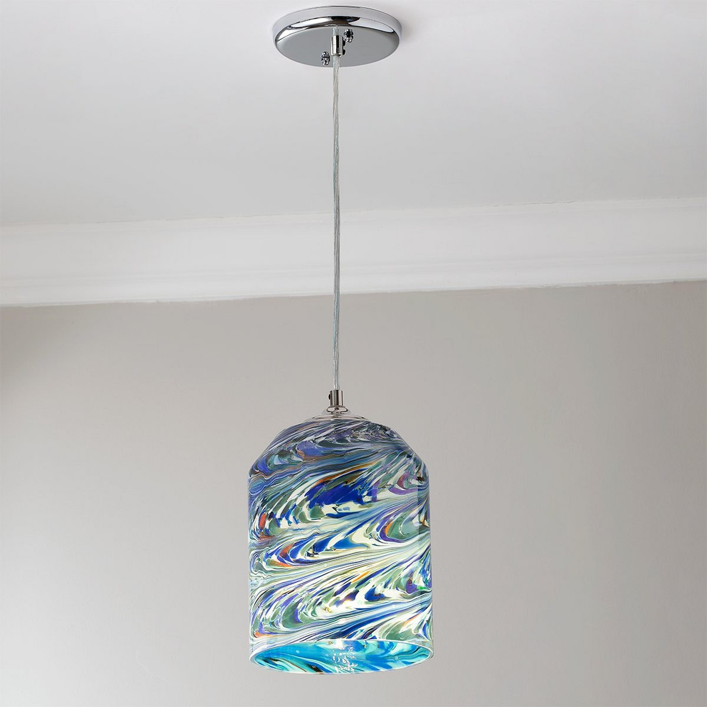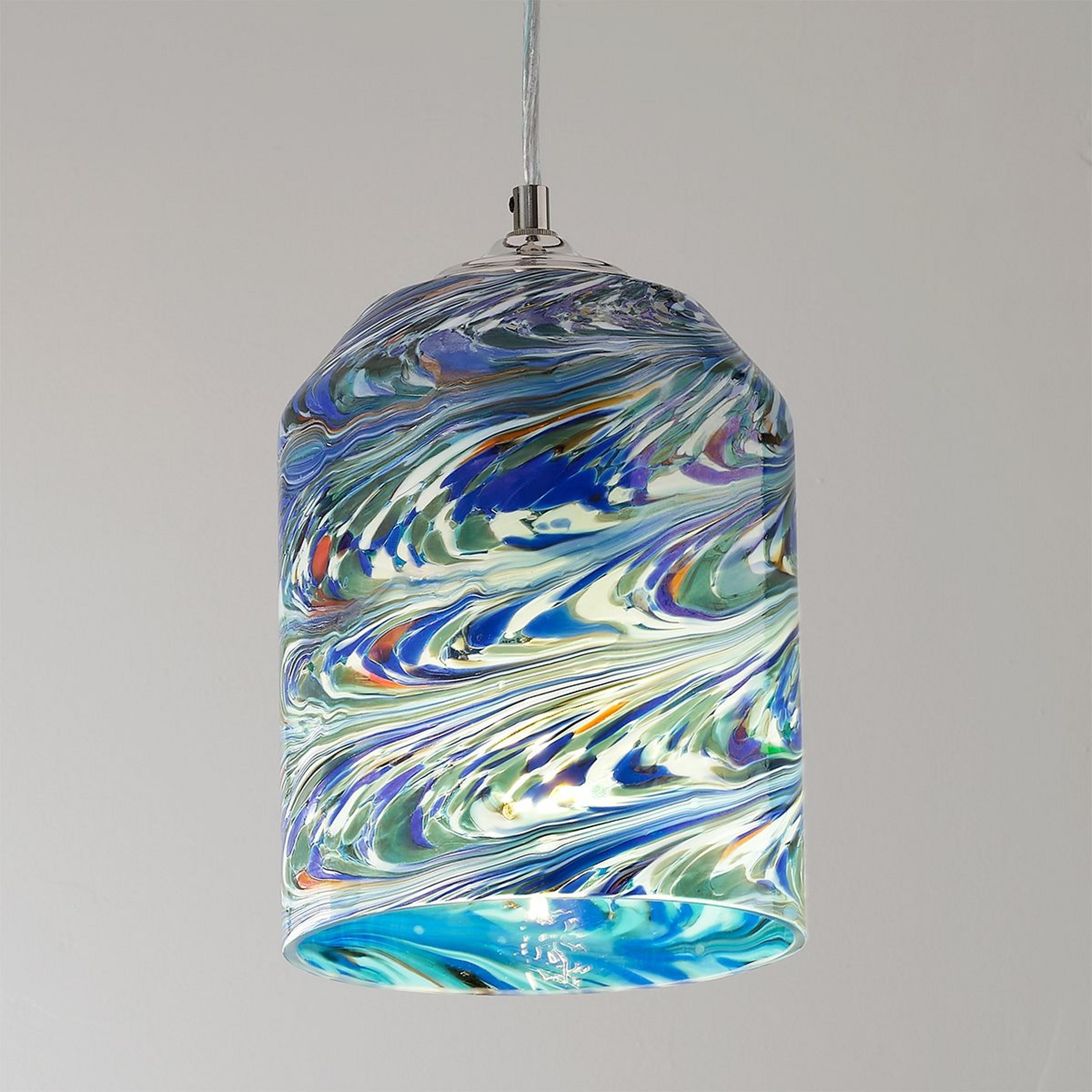 The wave pattern on the glass provides the essence of movement and is reminiscent of sky and ocean. Captivating mosaic-style glass in shades of teal green, indigo blue , white and specks of red. Due to the nature of this art glass pendant, no two will be exactly alike in color, pattern, or shape.