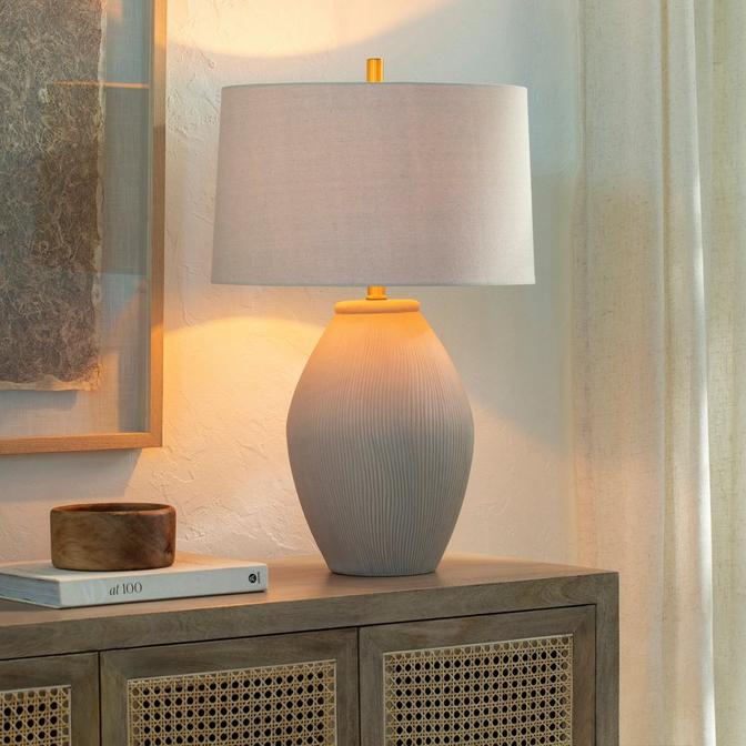 Feature this lamp prominently to accentuate warmth and texture. Its glazed ceramic body displays subtle vertical grooves reminiscent of swirling sand dunes that give off an earthy, grounding feel.