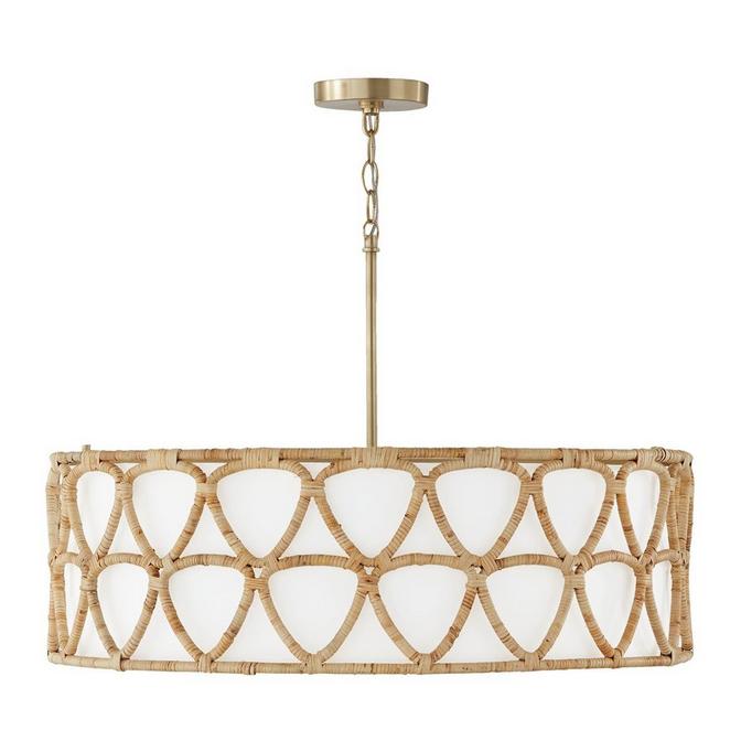 Bringing laid-back luxury to life, geometrically hand-wrapped rattan adorns a drum chandelier with an inner clean white shade to add a serene and inviting touch to the home. Feature this light over a dining room table to establish a stylish focal point.