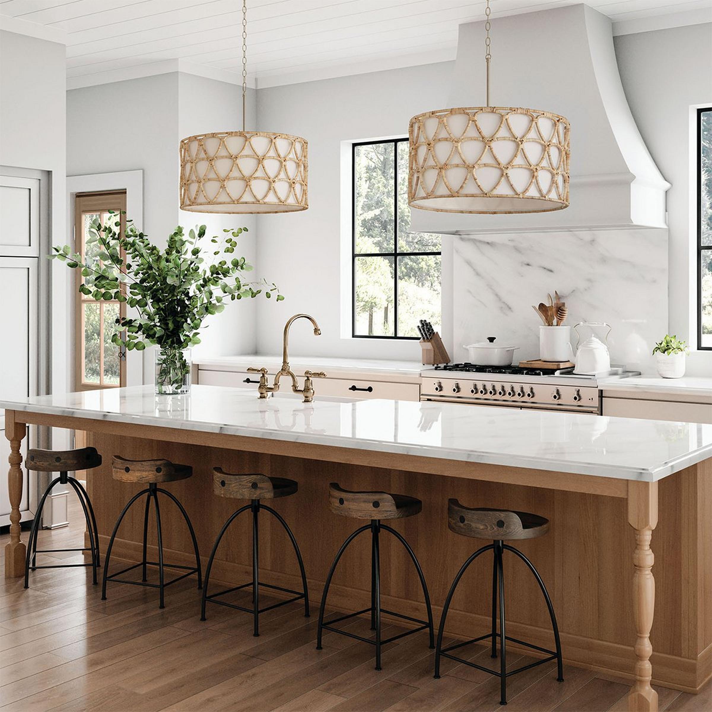 Bringing laid-back luxury to life, geometrically hand-wrapped rattan adorns a drum chandelier with an inner clean white shade to add a serene and inviting touch to the home. Feature this light over a dining room table to establish a stylish focal point.