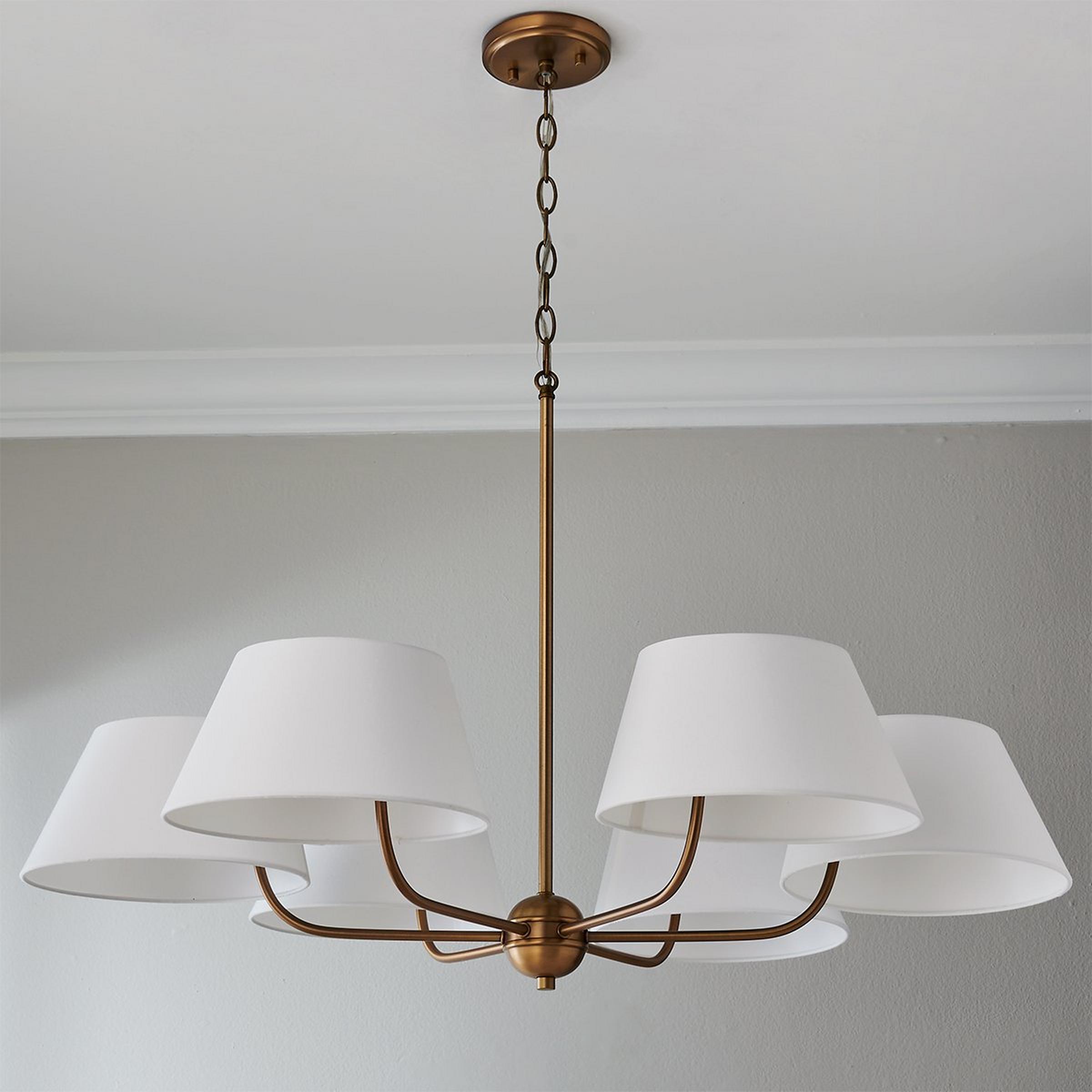 Reflect the architecture of a room by styling this classic chandelier as the focal point! With its graceful curves, elegant six-light design, and angled white fabric shades, this light is perfect for bringing a casual yet sophisticated atmosphere to the home.
