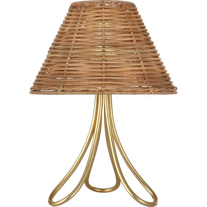 Infuse your space with a warm, sculptural glow. The Jenna table lamp pairs natural texture with refined metalwork, creating a piece that feels both grounded and gracefully elevated. The woven rattan shade casts a soft, dappled light, bringing an artisanal warmth to any room. Beneath it, a gild-finished trivet base with quiet elegance, forming an airy, architectural foundation that feels almost weightless. Perfect for bedside tables, reading nooks, or console vignettes, Jenna bridges rustic craftsmanship and sophistication. Its organic silhouette and mixed‑material design make it a versatile accent—equally at home in a sundry of interior spaces. Rechargeable LED lightsource and charging cord included. Multi-unit universal charging stations are available but sold separately.