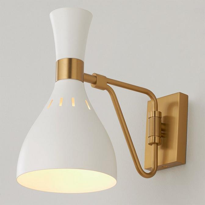 Pairing a rich, two-tone finish with bold, geometric lines gives Joan luxe appeal. Warm Burnished Brass joins with either Midnight Black or Matte White in a thoughtful juxtaposition of contrasting finishes on the 5-light chandeliers, the 1-light wall sconces and the 1-light table lamps. Each iconic, hourglass-inspired shade features small perforations towards its crown, allowing a soft glow to shine through, further articulating the distinctive details of this chic collection.