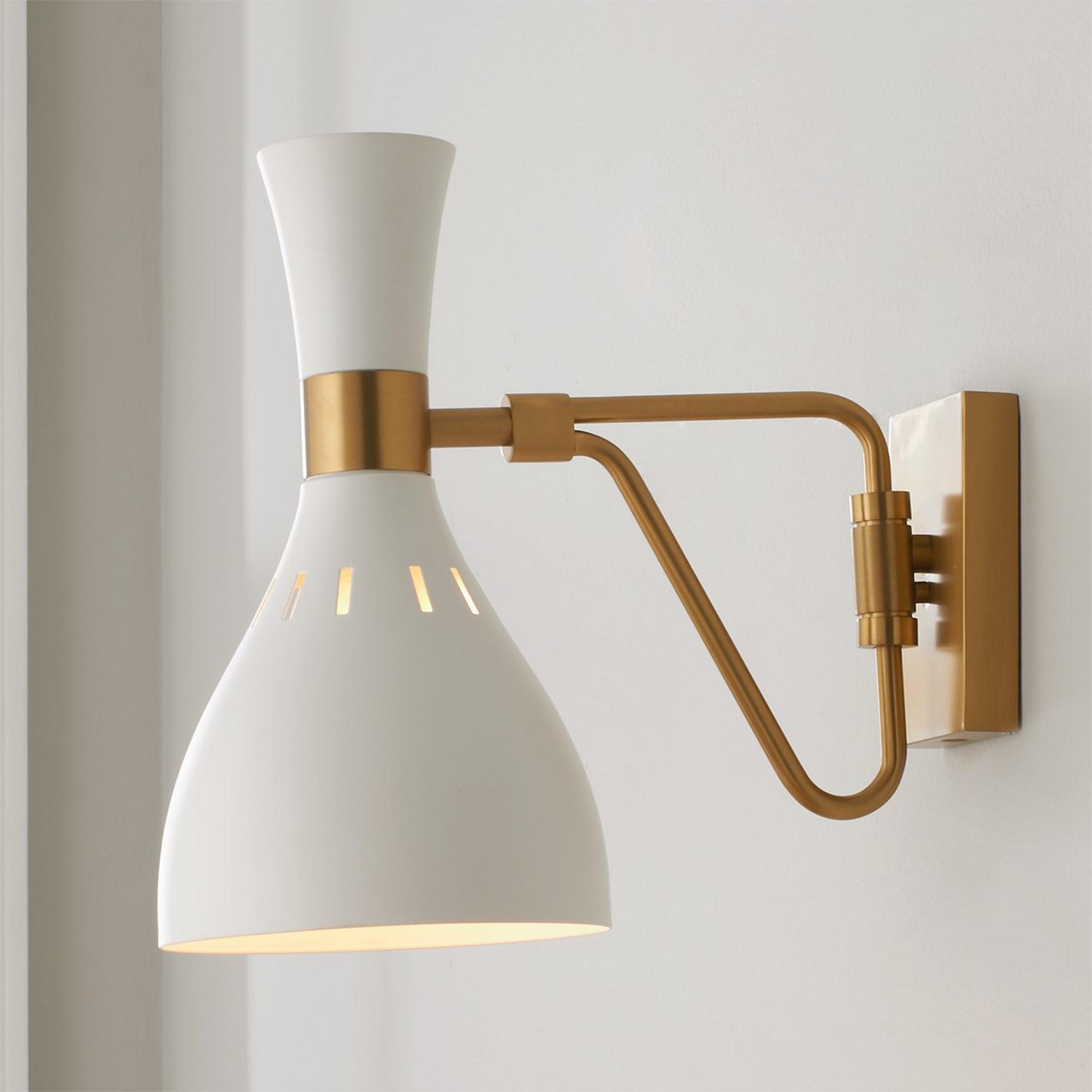 Pairing a rich, two-tone finish with bold, geometric lines gives Joan luxe appeal. Warm Burnished Brass joins with either Midnight Black or Matte White in a thoughtful juxtaposition of contrasting finishes on the 5-light chandeliers, the 1-light wall sconces and the 1-light table lamps. Each iconic, hourglass-inspired shade features small perforations towards its crown, allowing a soft glow to shine through, further articulating the distinctive details of this chic collection.