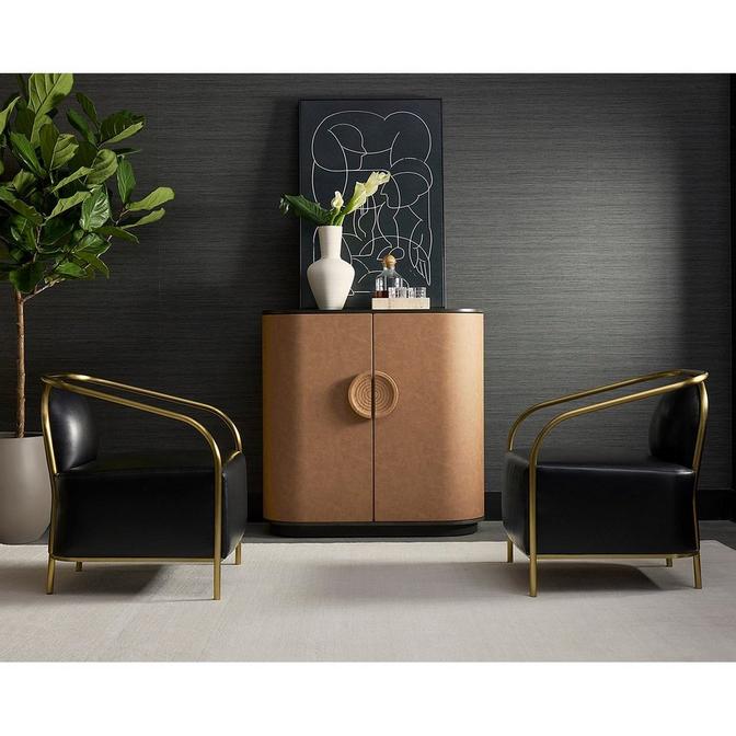 Unique and functional, this bar cabinet features six racks of stemware storage above one flat shelf and four compartments for bottle storage. Stylishly blending materials, the doors are wrapped in leather with solid oak handles. The curved front adds an additional dimension of style, and works exceptionally well nearby round or oval dining tables.