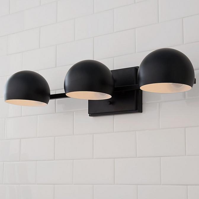 Rounded domes shade our Just Enough Retro Vanity Light, creating a flawless light source for your modern bathroom. The matte black hue sets a sleek tone for this trendy fixture. Vintage in appearance but new in design, incorporate a dash of yesteryear into your spectacular space.