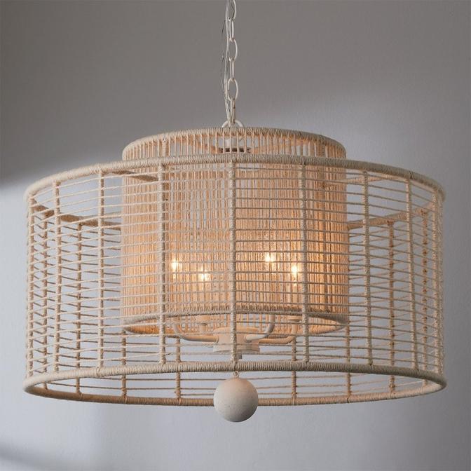 Our Jute Veil Chandelier brings new life to a nautical sense of style. The layered shades have a jute wrap around the entirety of the frames with a fun cork finial to finish off the fixture. This bold piece boasts a calming color tone that will glow in your living room or dining room.