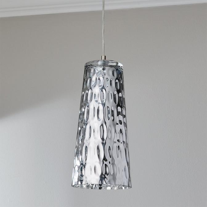 Icy landscapes and frosty vibes are captured in the tapered silhouette and cool dimpled surface of this light. Kakisa, with its mercury glass finish and polished nickel hardware, brings a touch of frozen elegance to any space. Please note that due to the handmade nature of art glass, differences in color, pattern, and shape should be expected and celebrated; no two fixtures will be exactly alike, adding to the unique nature of the pendant. This fixture is assembled by hand in our Richmond, Virginia production facility.