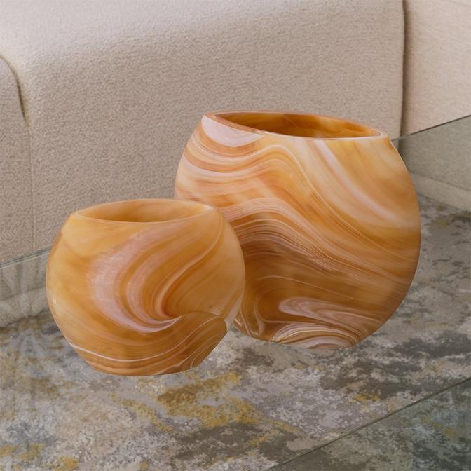 The Kame vases showcase the beauty of glass craftsmanship with their stunning caramel, ivory, and tan finish. Add your favorite florals to transform any space into a serene oasis. Large (9Hx10Wx4D). Small (6Hx7Wx4D).
