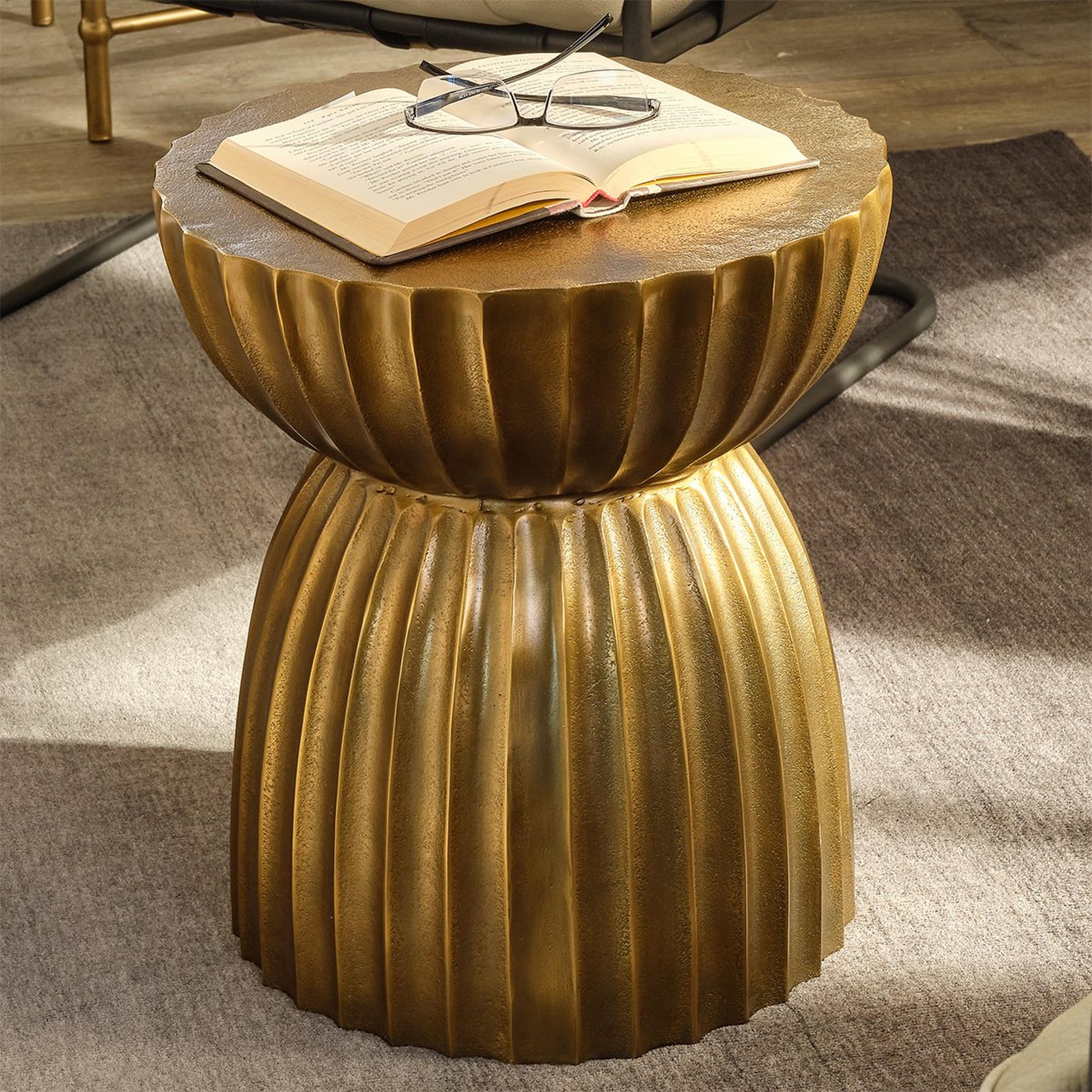 The Karka Accent Table brings bohemian elegance to your space. Made from sturdy cast aluminum, it features an antique brass finish with heavy distressing that adds character. This unique table serves as both a statement piece and a functional accent, enriching the ambiance with its warm, artistic design.