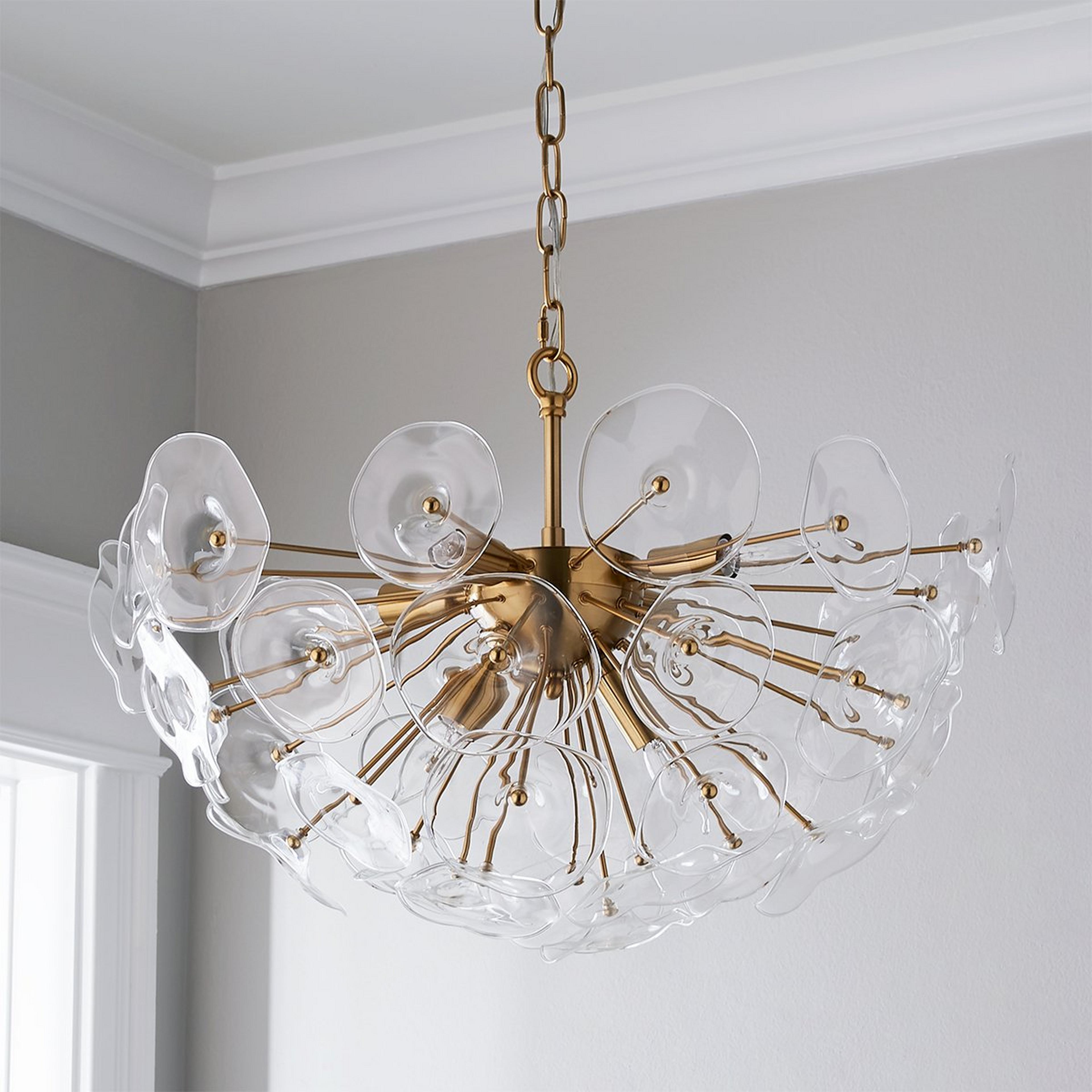 A unique take on modern design in a favored bowl silhouette, our Kendari Chandelier will be the wow factor your dining room is looking for. The wavering glass elements are matched with plated brass for warm light and flair of sophistication.