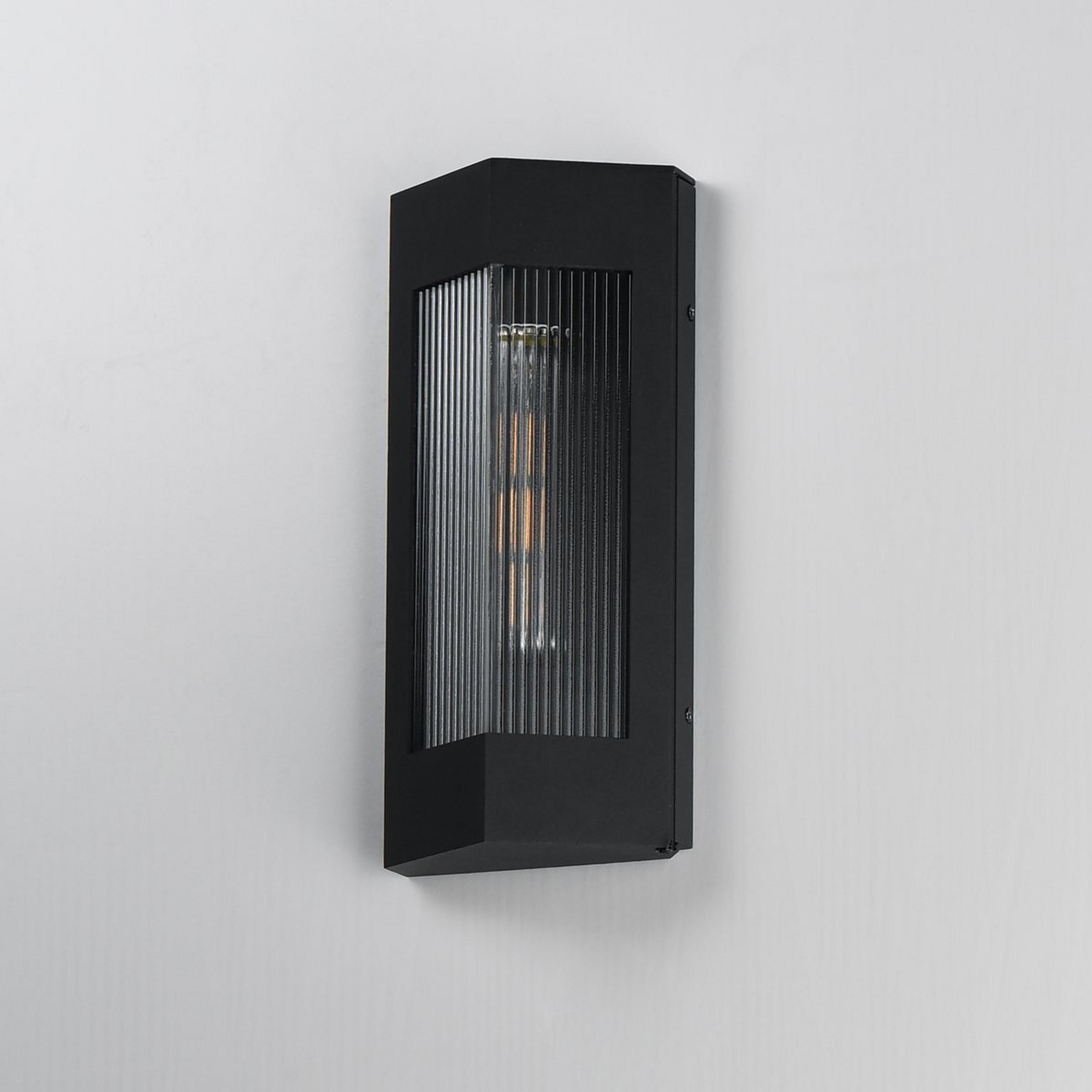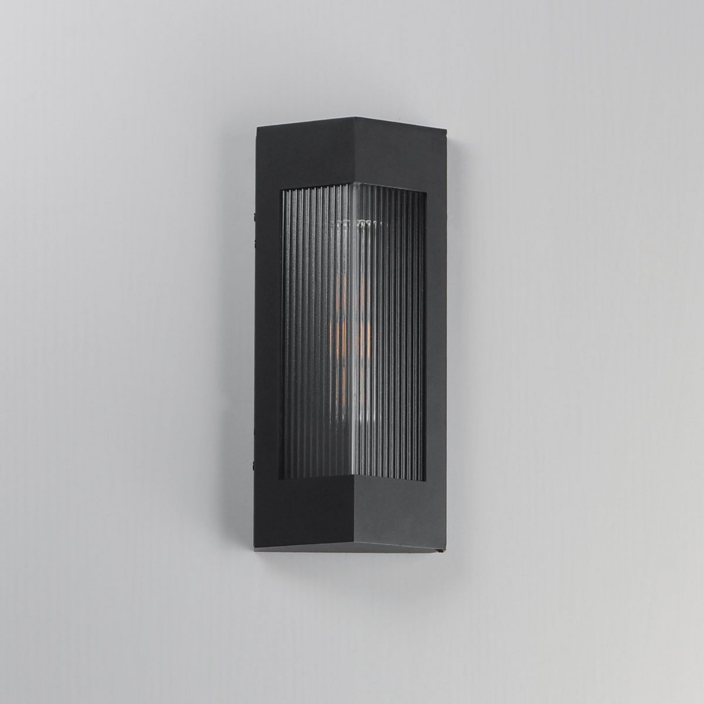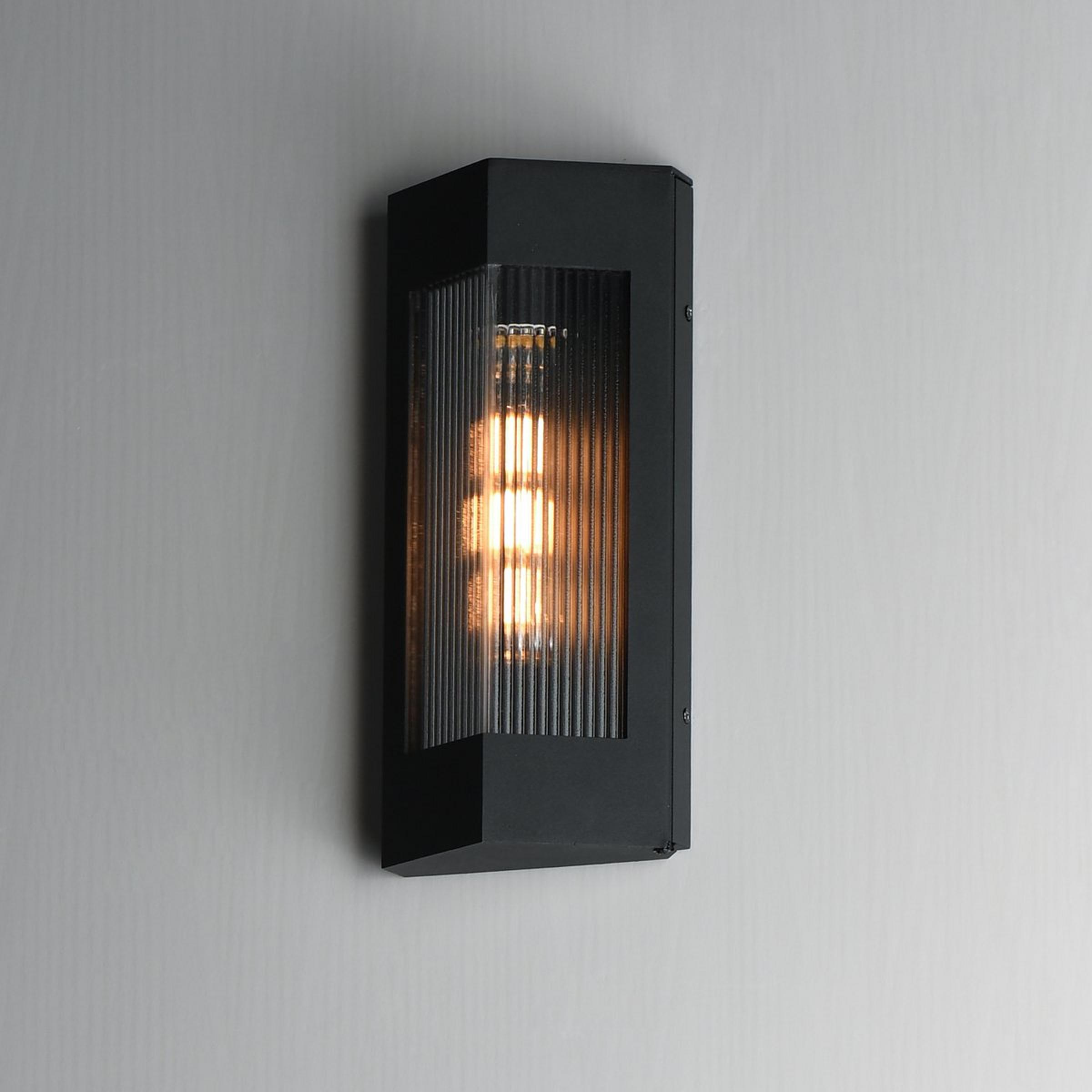 This angular sconce emits a dazzling display of light through a ribbed glass shade. The thin design is ADA compliant as it does not protrude far from the wall, making it a functional masterpiece installed along the path from driveway to door.