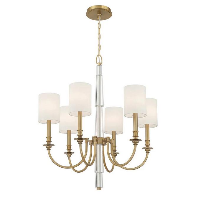 This grand chandelier uses a mix of materials and layering effects in the design to create a glamorous piece that feels elegant and smooth rather than bold and ostentatious. The curvature of the swooping support rods gracefully allows them to hold candelabra luminaires upright as the chandelier hangs above a front entry, living space, or dining area. The central crystal frame appears strong yet stable as it supports the entire chandelier with poise. The crystal catches, refracts, and sparkles from the light cast through the cylindrical shades.