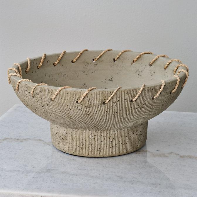 The Kithara Bowl showcases expertly threaded natural jute and vertical striations in a matte-textured ceramic finish. This beautiful bowl enhances the decor of any kitchen island, living room console table, or breakfast dining table. Please note that this product, or parts of it, are handcrafted by artisans, making each piece unique in finish, tone, texture, and color. It is not water-tight or food safe.