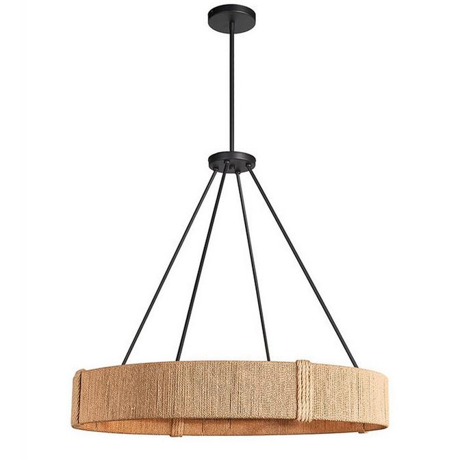 Bringing a sense of organic charm, the rapped rattan fiber surrounding the frame of Koa gives this chandelier a relaxing feel. The wide ring hangs from a dark metal frame, contrasting the rattan's casual coastal motif.