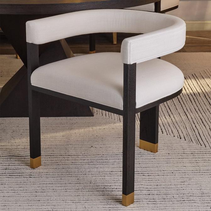 The Koine Dining Chair displays elegance from every angle. With its crisp white linen upholstery and sturdy oak tri-leg frame in deep espresso, it combines comfort and style beautifully. Finished with brass ferrule hardware, this chair enhances any space, whether as a pair in your living room or around your dining table.