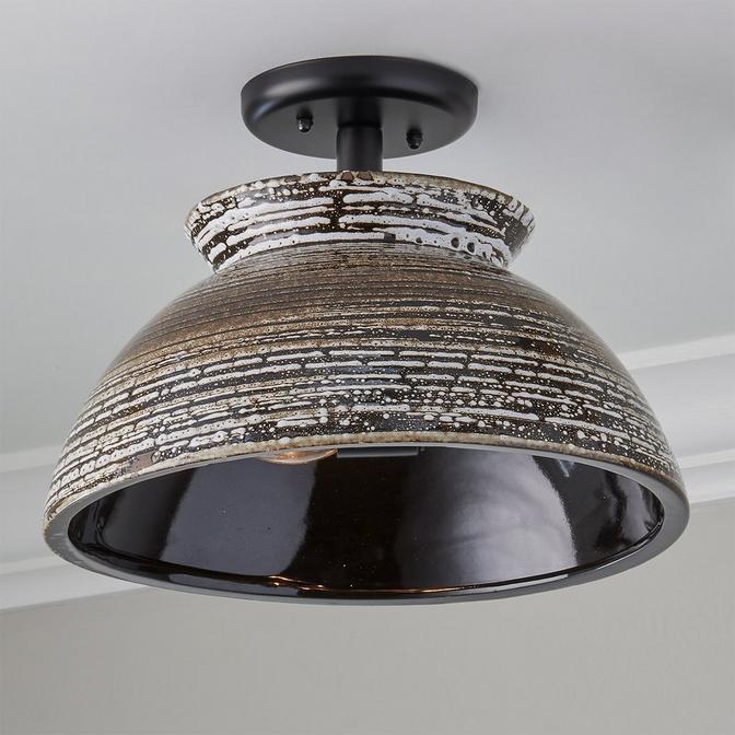 Meet the Ajax Ceiling Light: a stylish blend of chic and nature-inspired vibes. Made from ceramic, its bell shape gives off a cool look, while the inside sports a sleek smith black color for cozy lighting. On the outside, it's all about those organic vibes with the white, black, brown and tan stripes adding a touch of natural charm. This fixture is assembled by hand in our Richmond, Virginia production facility.