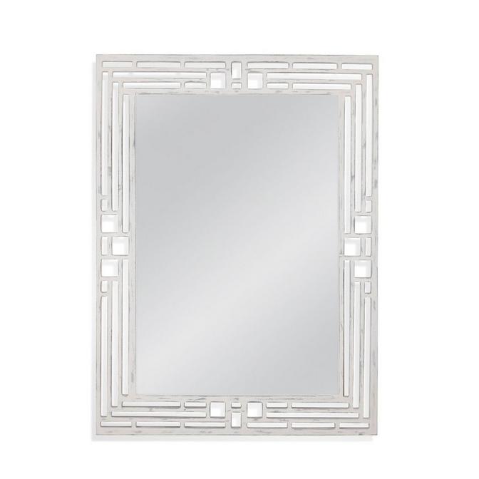 This weathered white mirror features linear cut outs for a peek of the wall behind. Because this product is handcrafted no two will be exactly alike in construction, adding to the unique charm and beauty of this lovely piece. Includes mounting hardware.