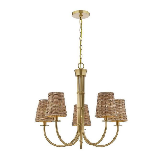 Inspired by nature and crafted from luxurious materials, this chandelier reimagines its classic shape with a touch of whimsy. The sweeping arms with bamboo-inspired connection points lead to rattan shades that warm the metallic frame. Create a serene space with this light's homage to natural elements, as it evokes a charm and sophistication that radiates in your dining room or living space. Descending from a matching chain, this piece's compact shape is ideal for illuminating circular tables and making your space cosy and intimate.