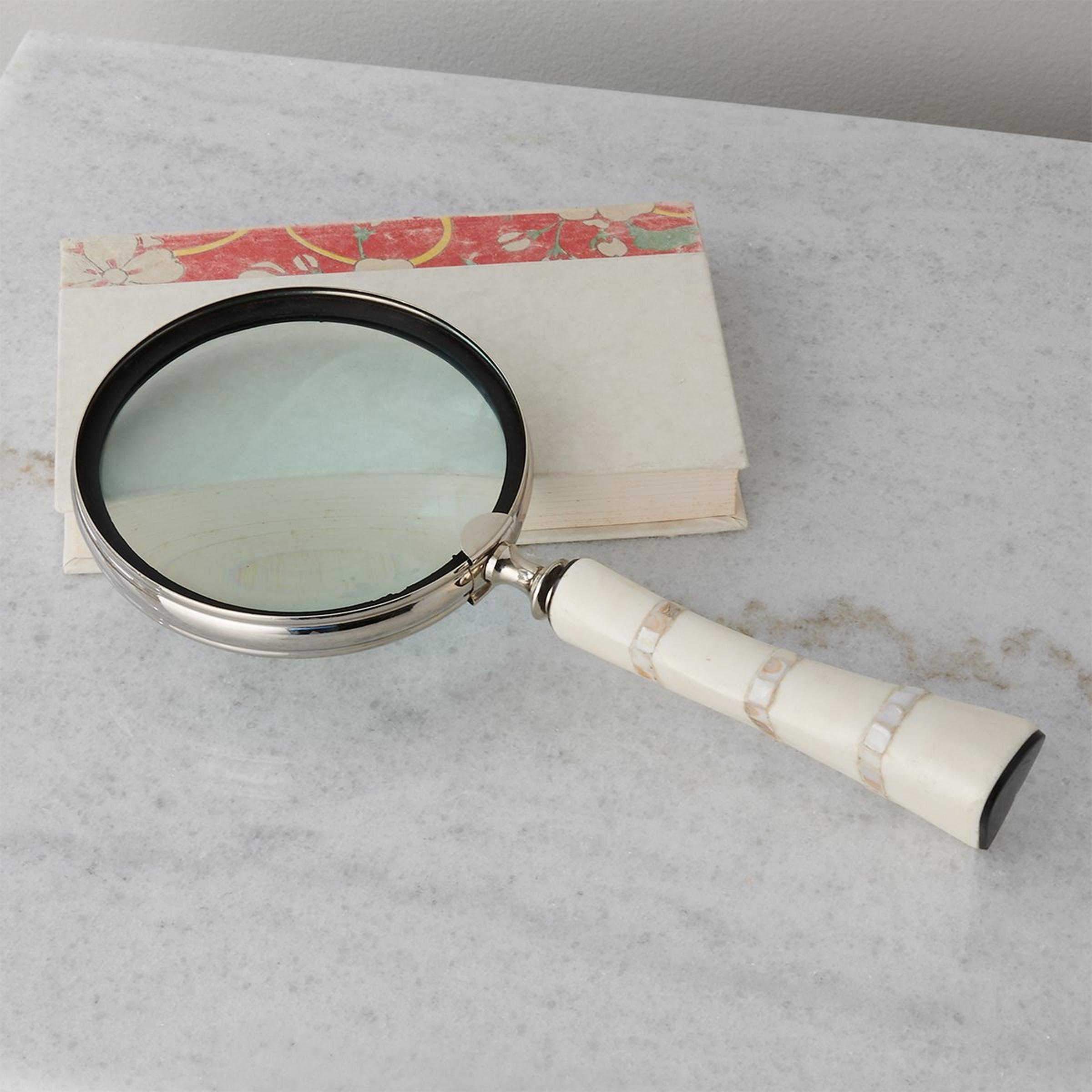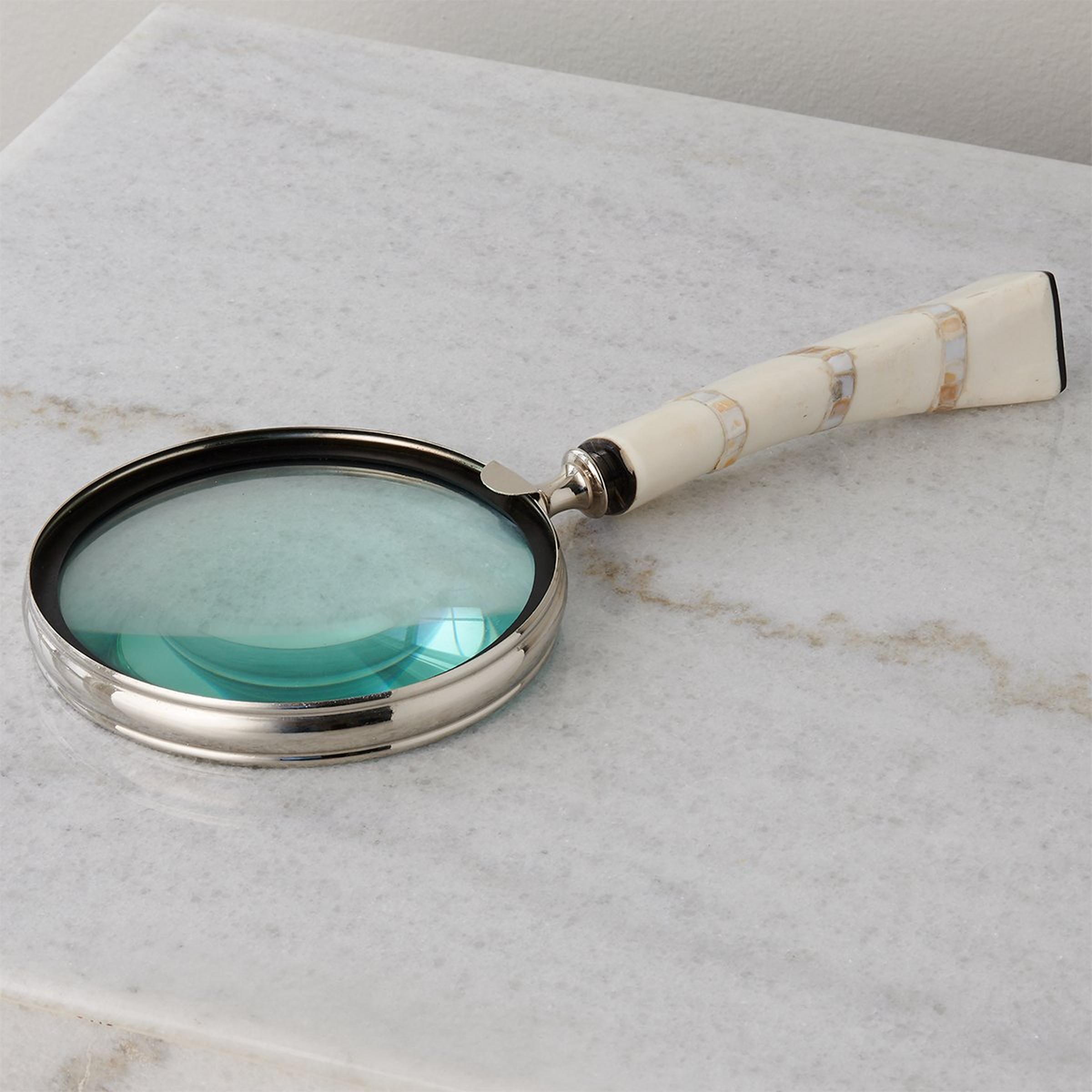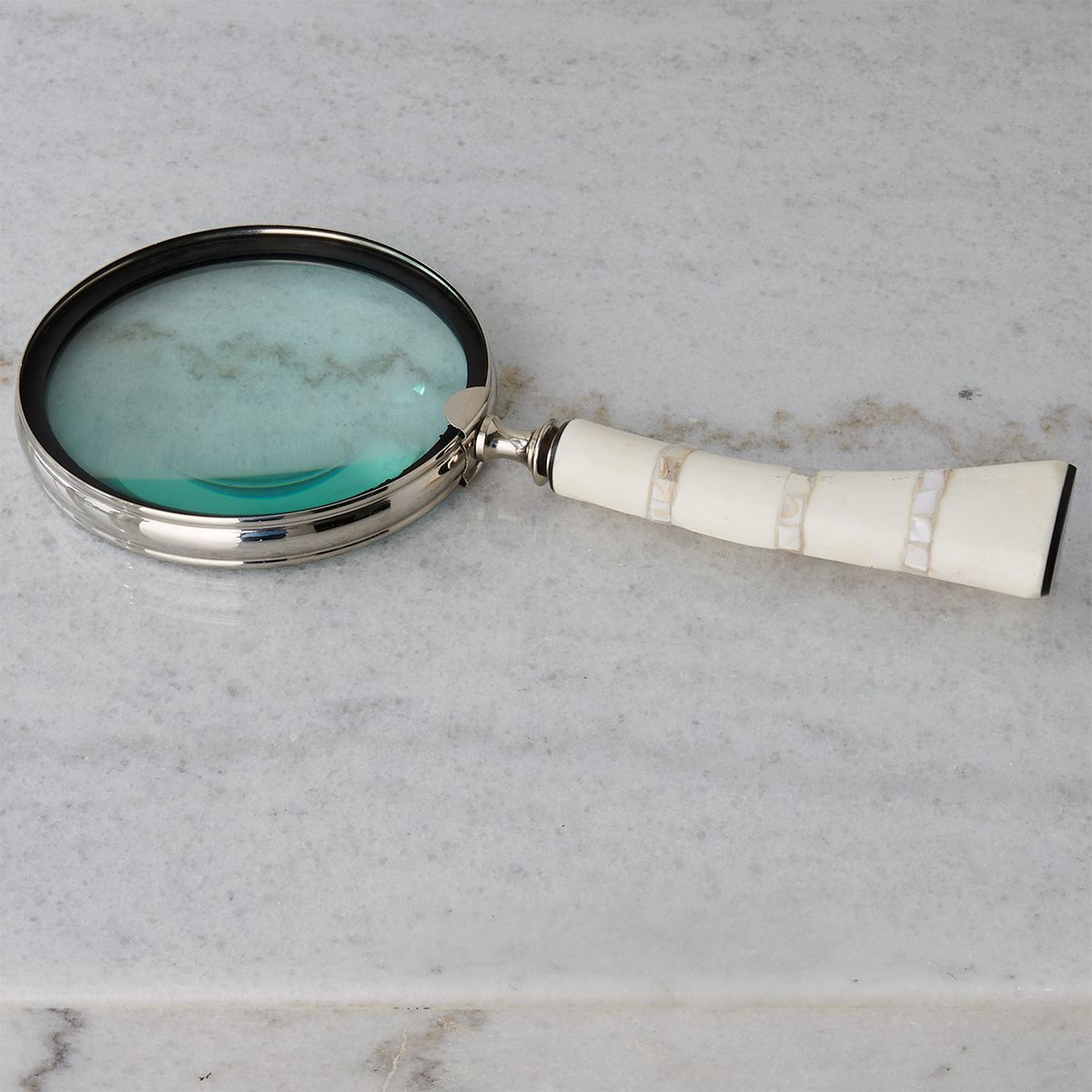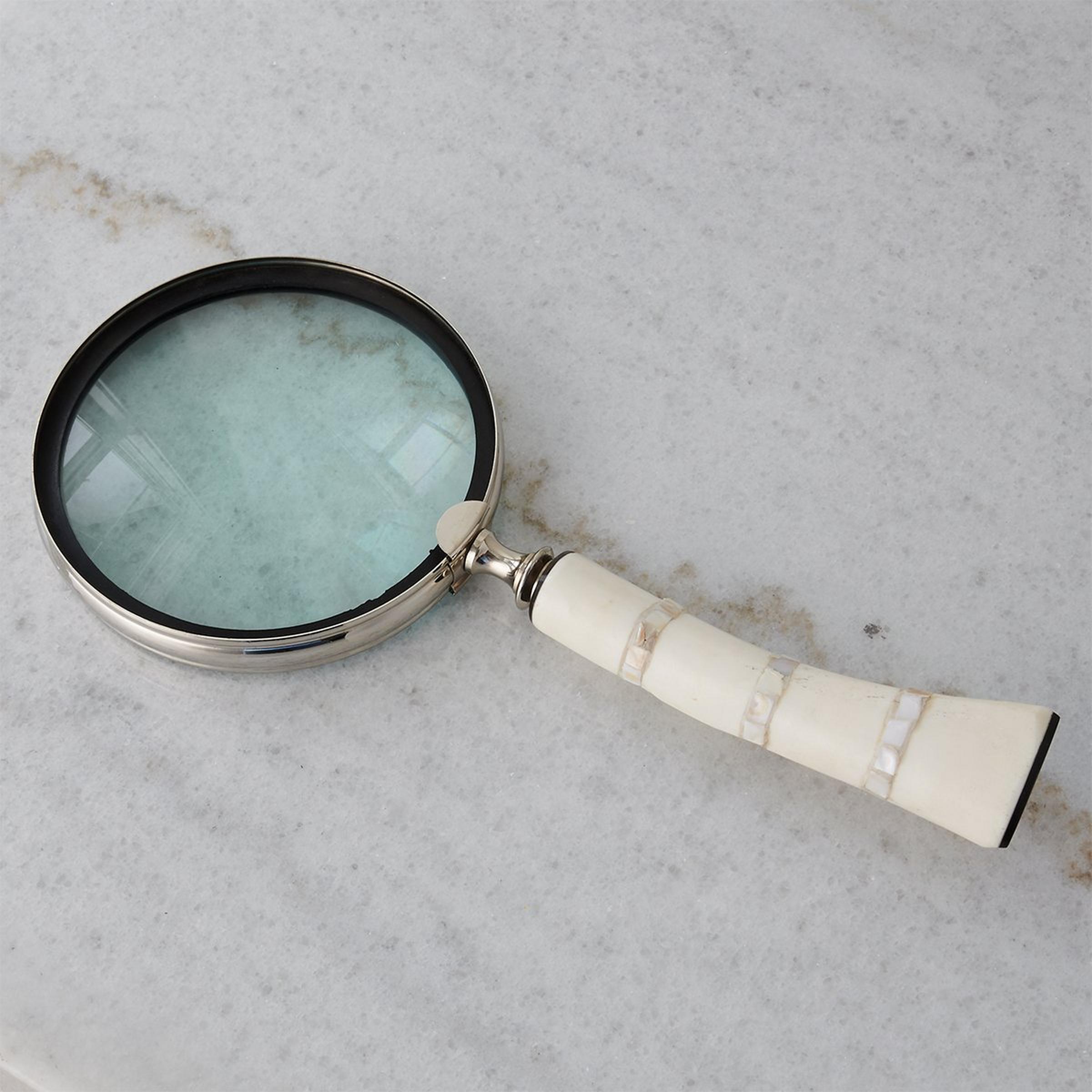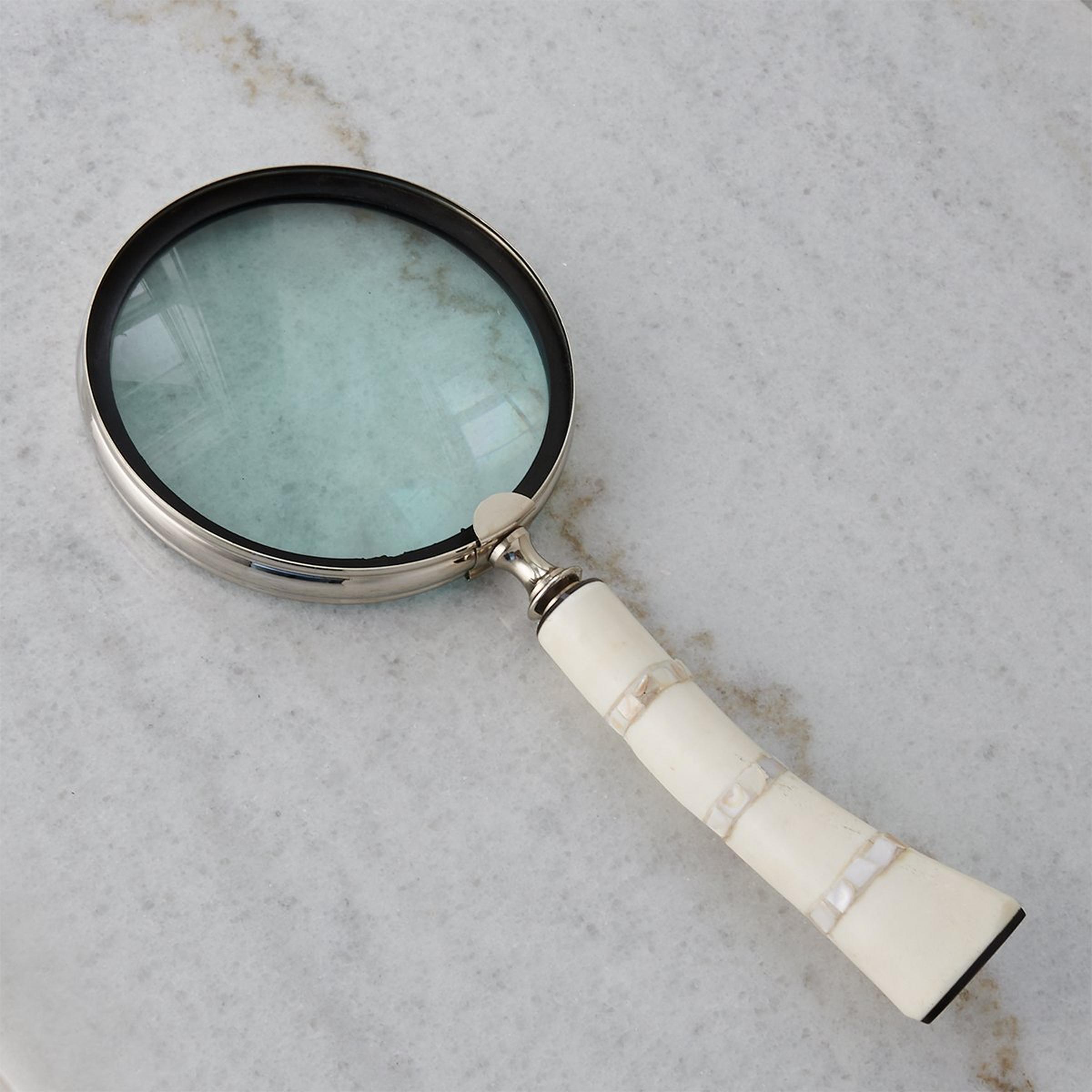 Solve any mystery that presents itself with our Lansbury Magnifying Glass. A bone handle accents the nickel finished lens for a stunning and functional piece of decor.