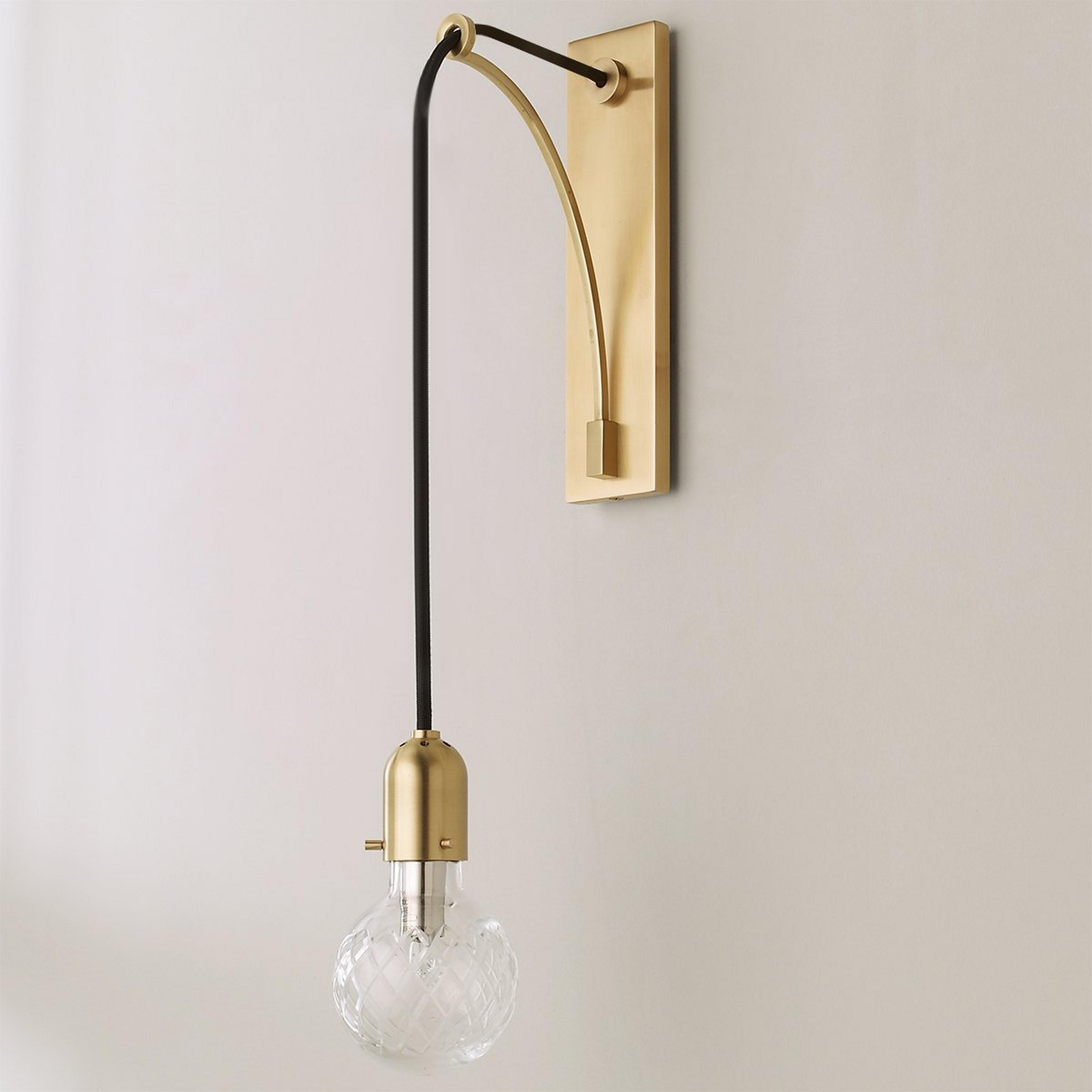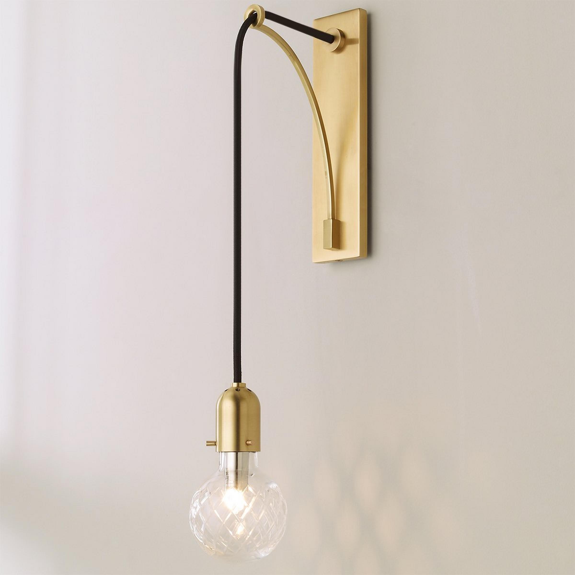 Wall sconce featuring hand cut, latticed glass resembling winter's first snowfall. Hung with a half vaulted, adjustable suspension, the sconce resembles the architecture of a bridge.