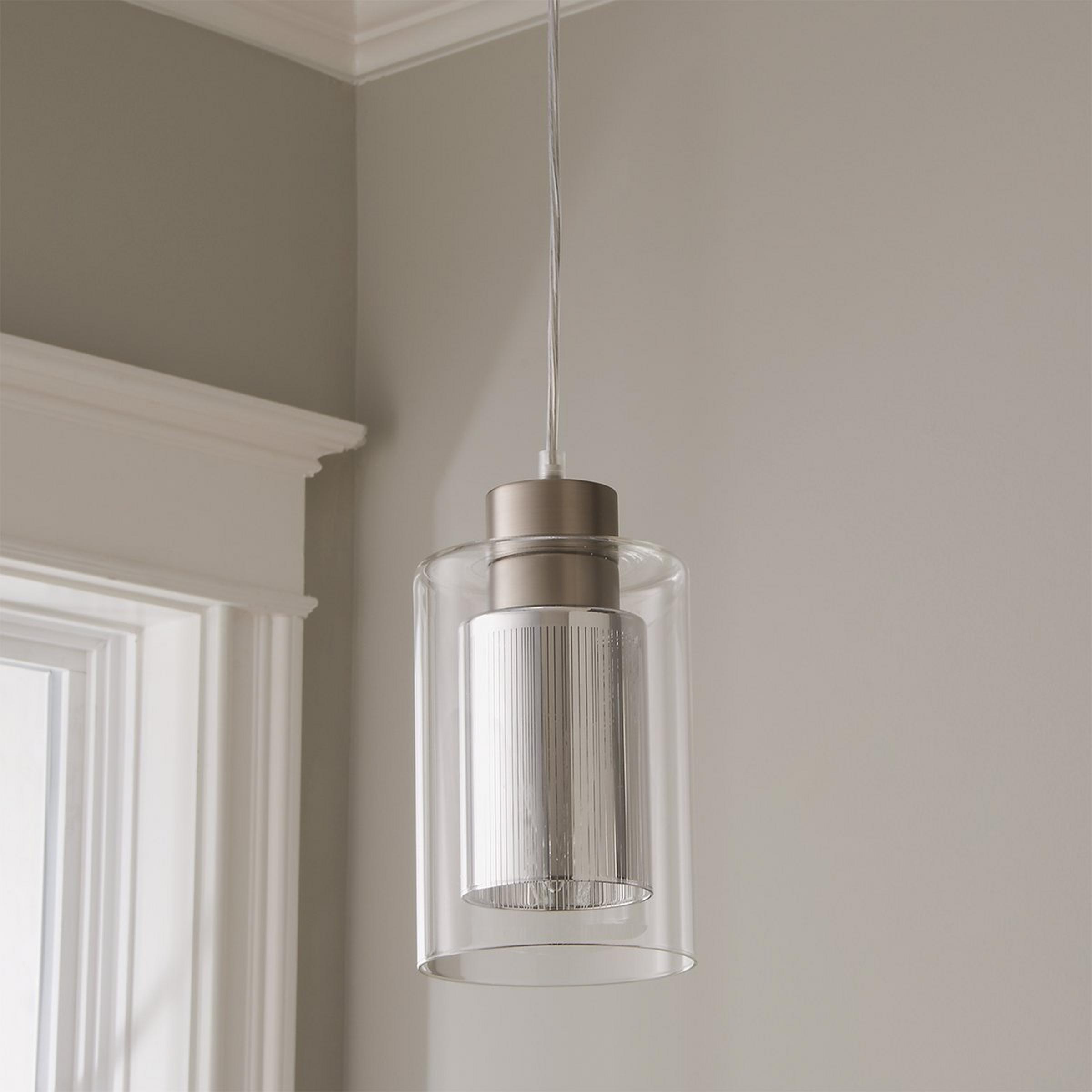 Combining different glass shades creates a layered look for this stunning pendant. The inside has a metallic, striped glass shade and clear outer glass that will illuminate your modern home.